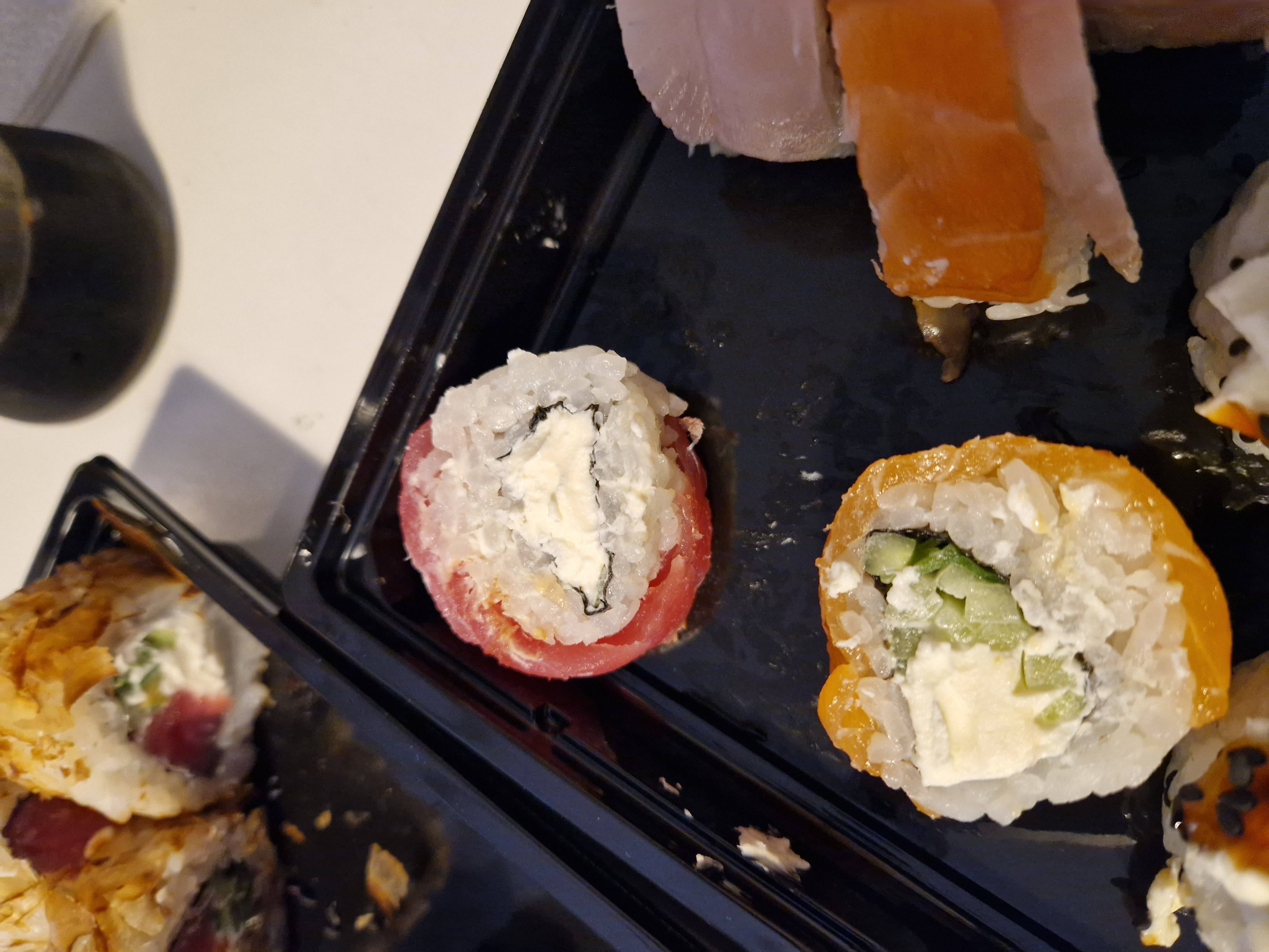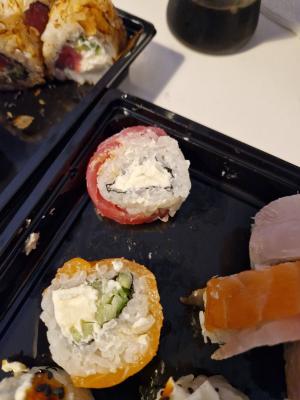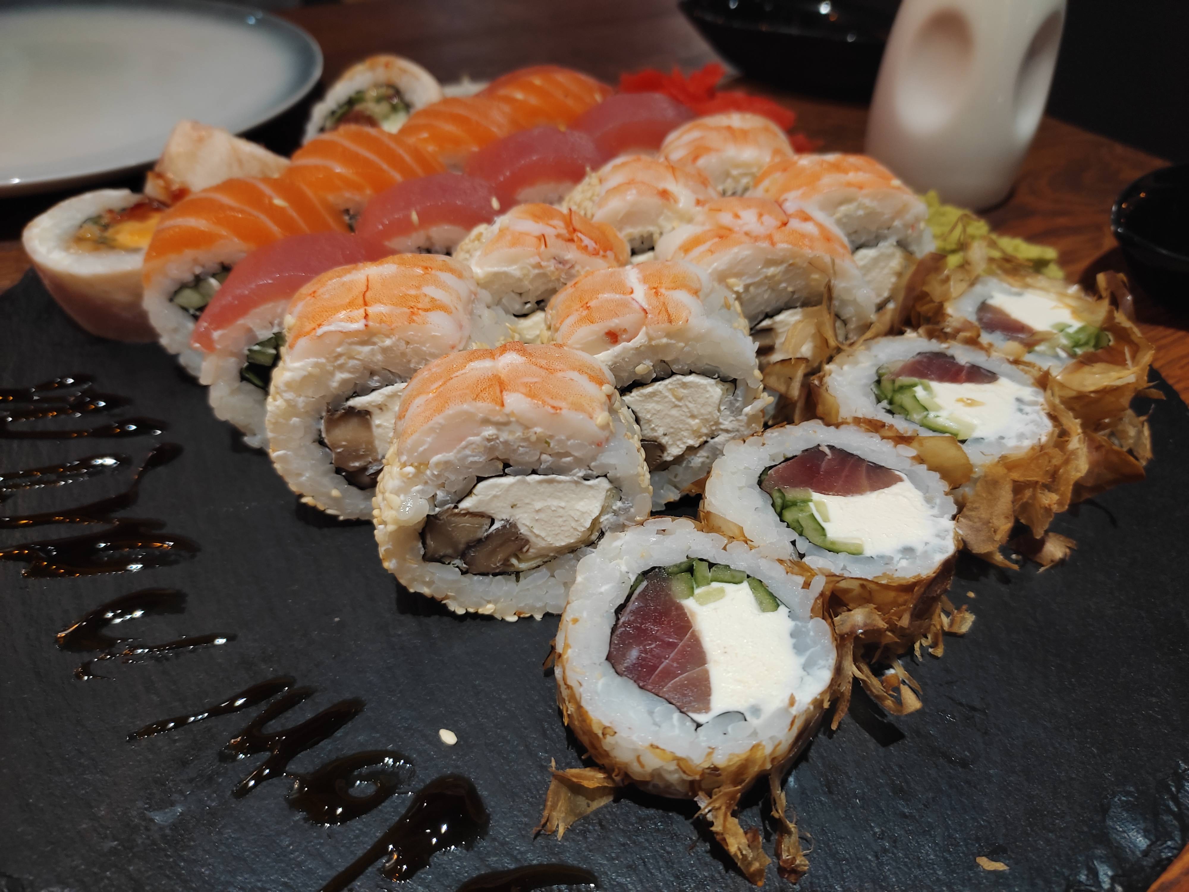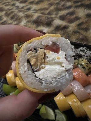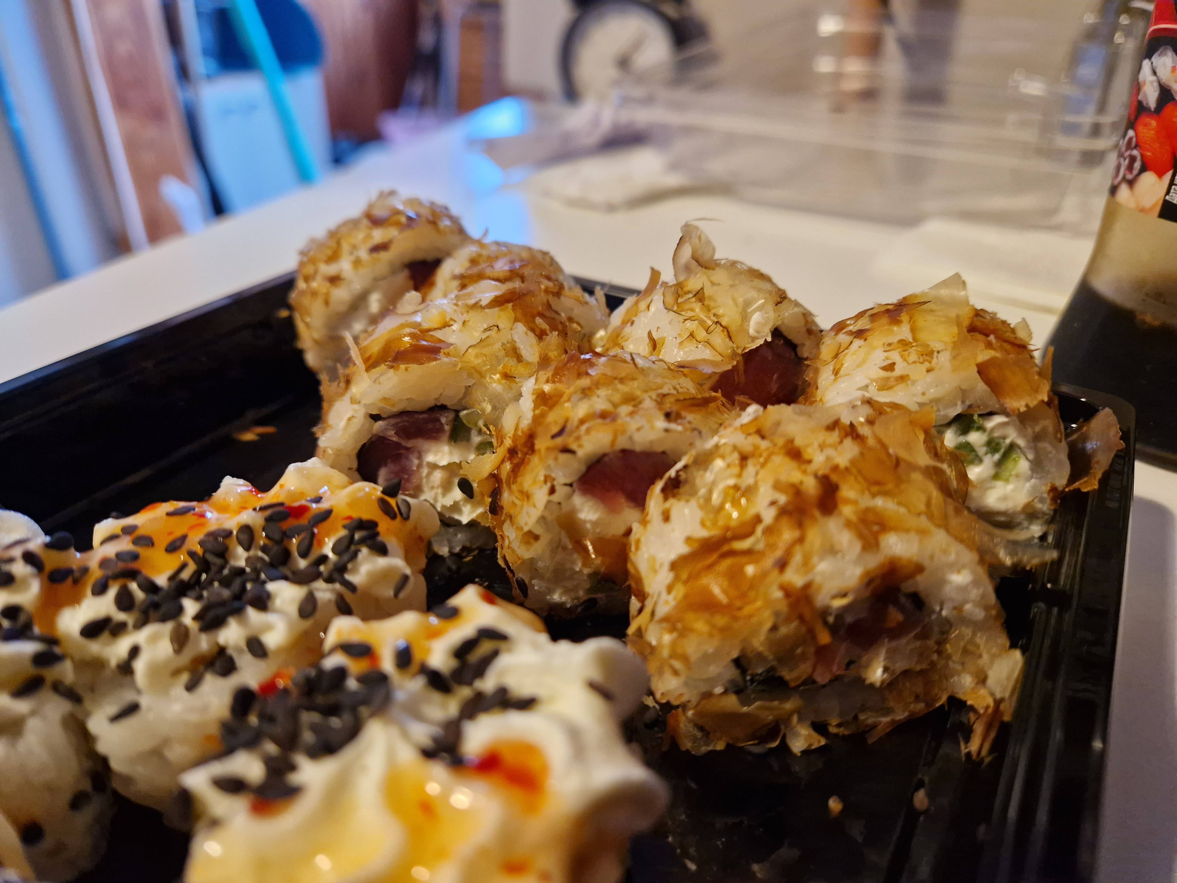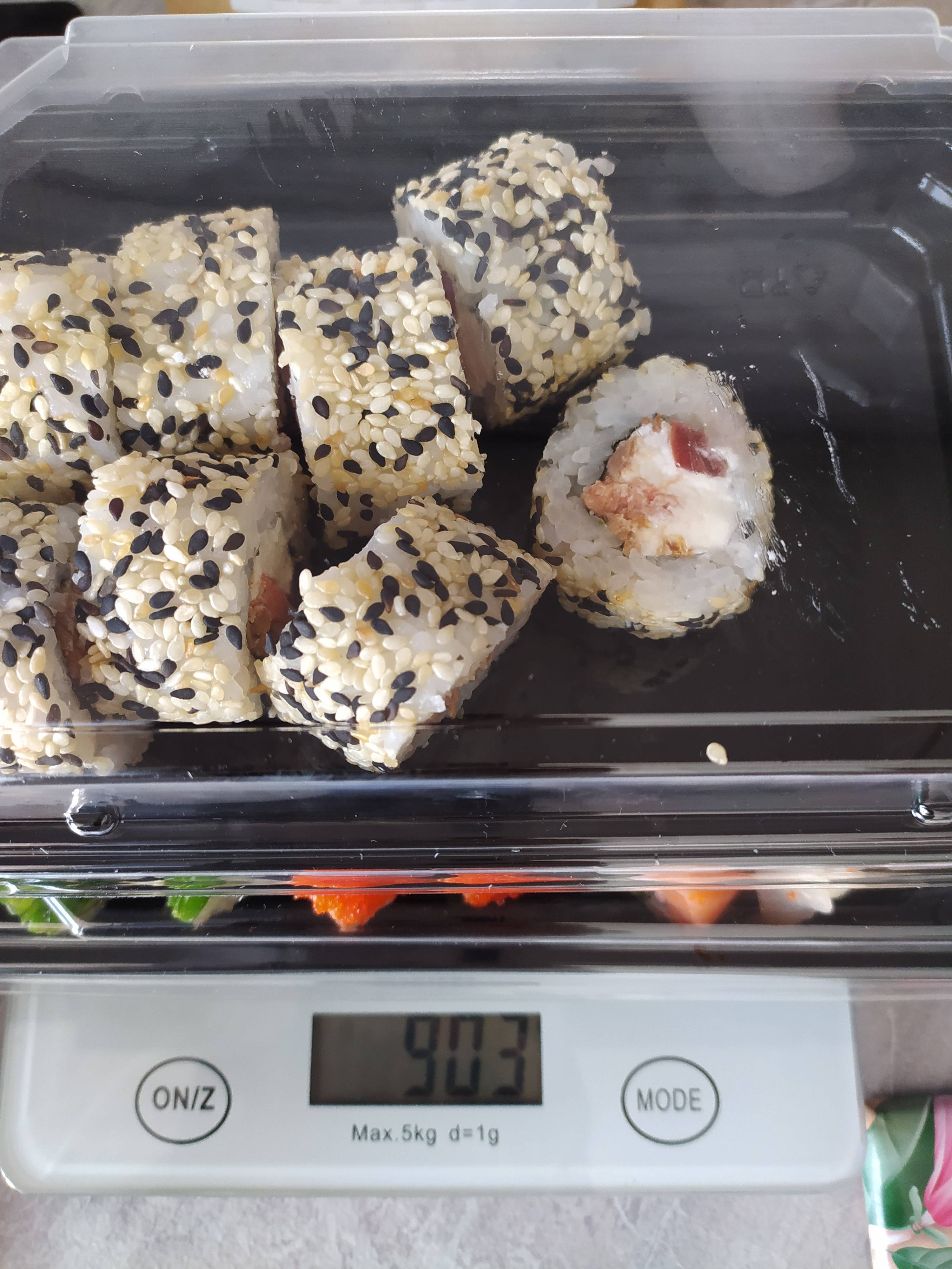 Состав: тунец, такуан, сыр, нори, рис, темпура
