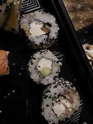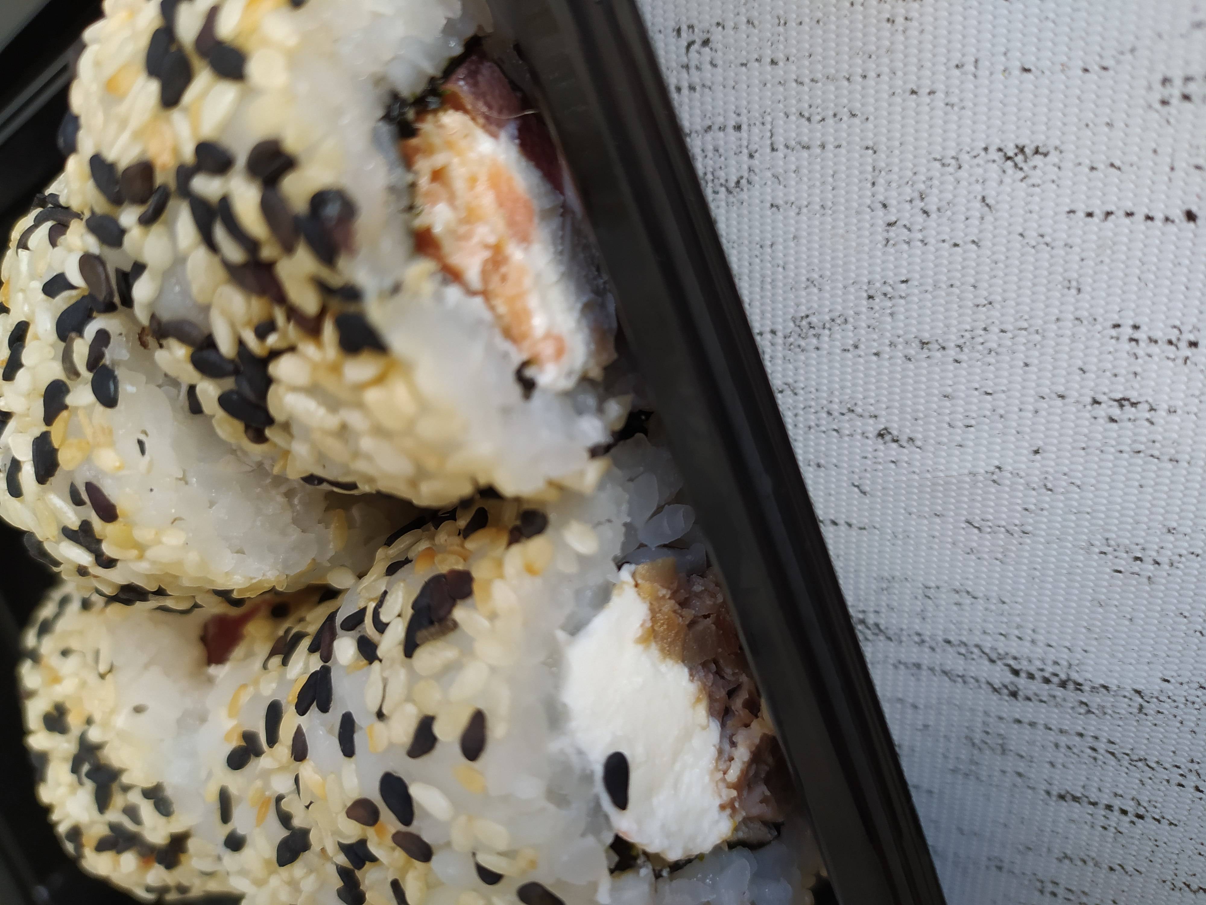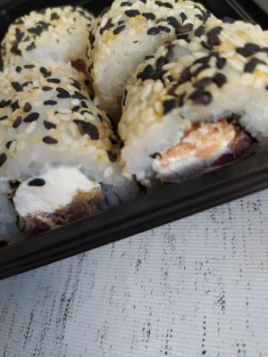 Состав: филе угря, авокадо, огурец, сыр, рис, соус терияки, кунжут