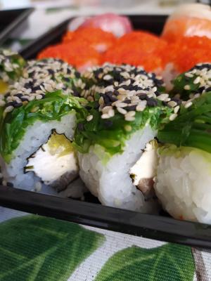 - ролл "Грин Эби Кроунинг": креветка тигровая, краб-микс, чука-салат, сыр, кунжут, нори, рис - 8 шт.