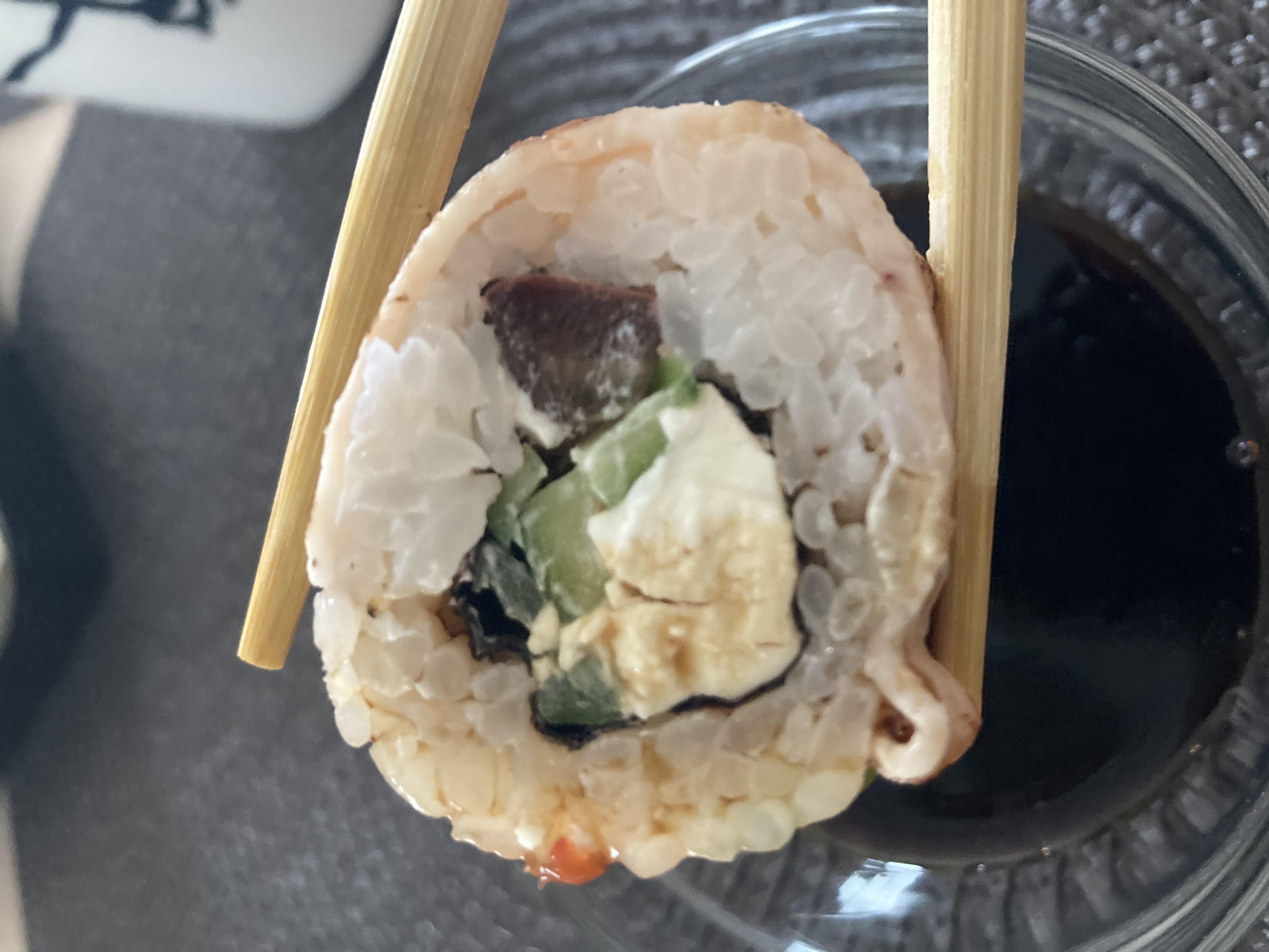 - ролл "Крем-шитаке в японском блинчике": грибы шиитаке, обжаренные в соусе терияки, крем-чиз, японский блинчик оранж, такуан, соус терияки, арахис, нори, рис - 8 шт.