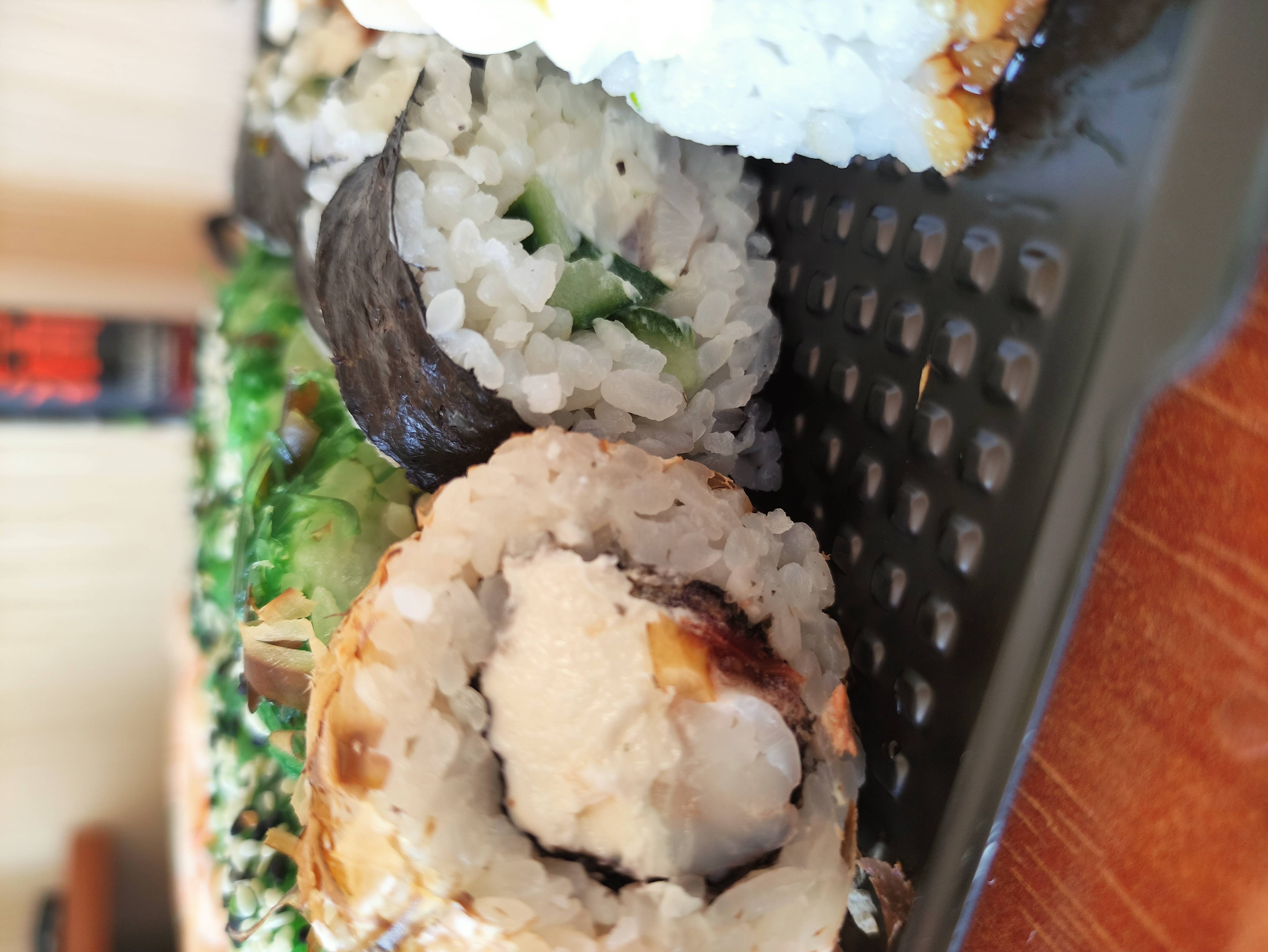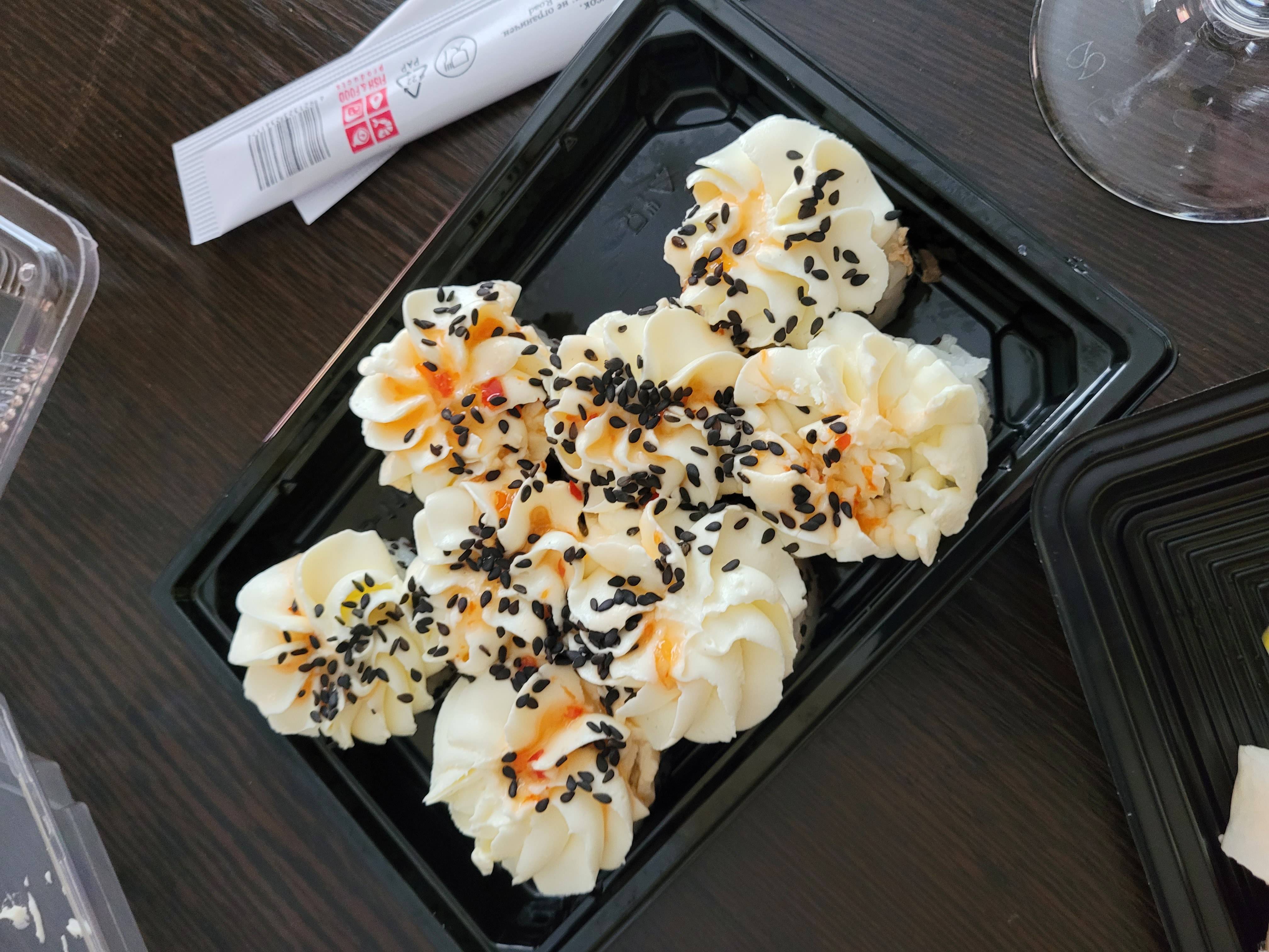 Состав: тунец, такуан, сыр, нори, рис, темпура