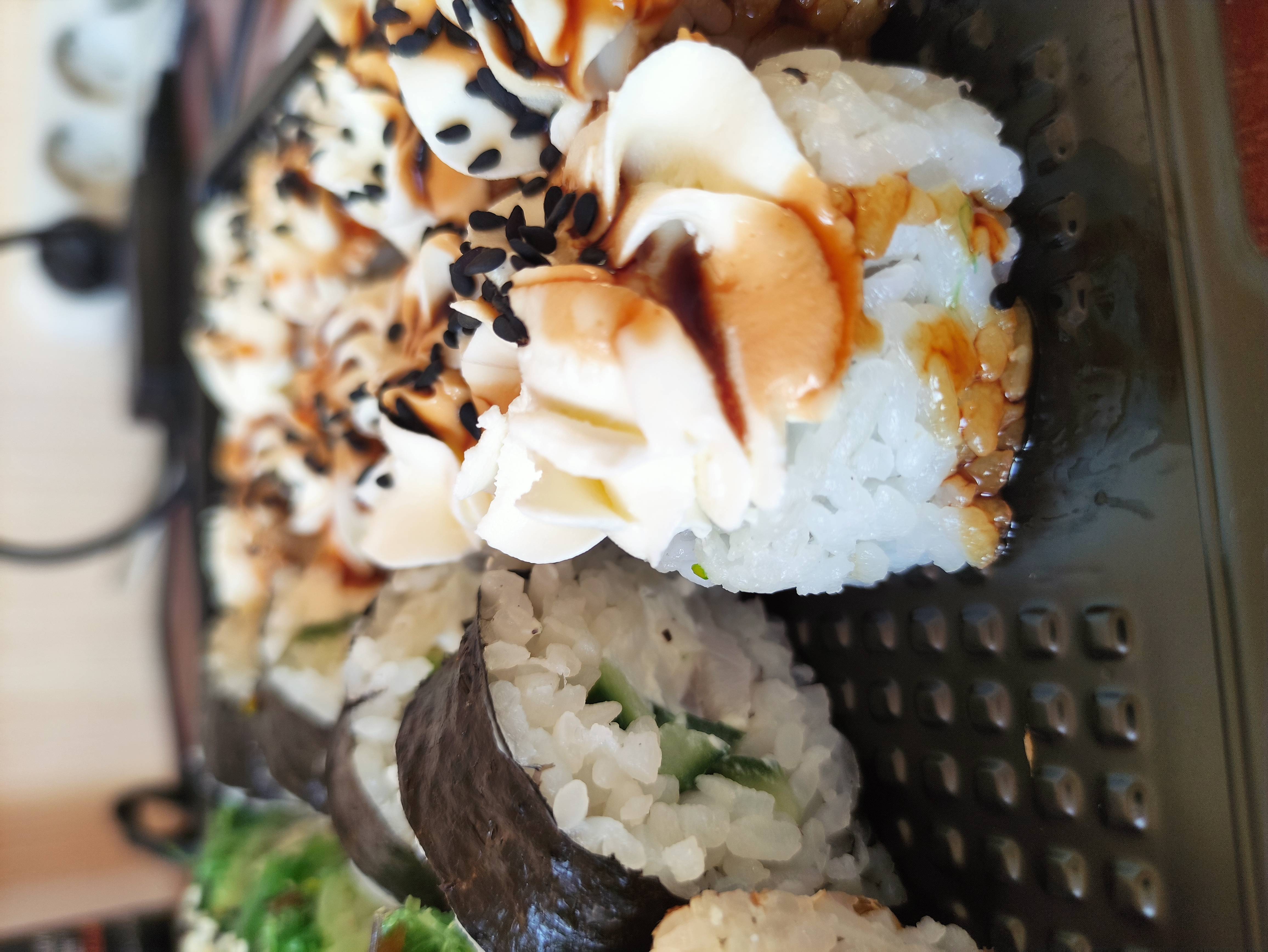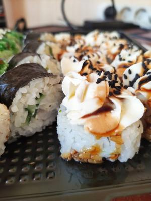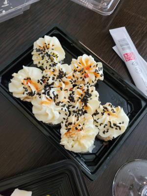 - ролл "Мидии терияки под сырной шапочкой": мидии, морковь терияки, кунжут, крем-сыр, соус терияки, нори, рис - 8 шт.