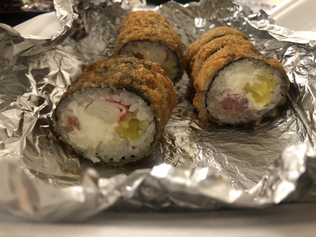 Состав: тунец, такуан, сыр, нори, рис, темпура