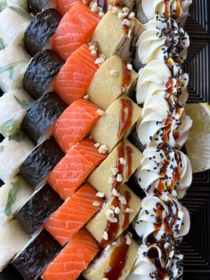 Состав: филе лосося, угорь, креветка тигровая, авокадо, огурец, сыр, рис, нори