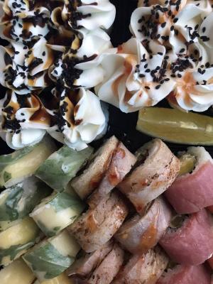 - ролл "Мидии терияки под сырной шапочкой": мидии, морковь терияки, кунжут, крем-сыр, соус терияки, нори, рис - 8 шт.