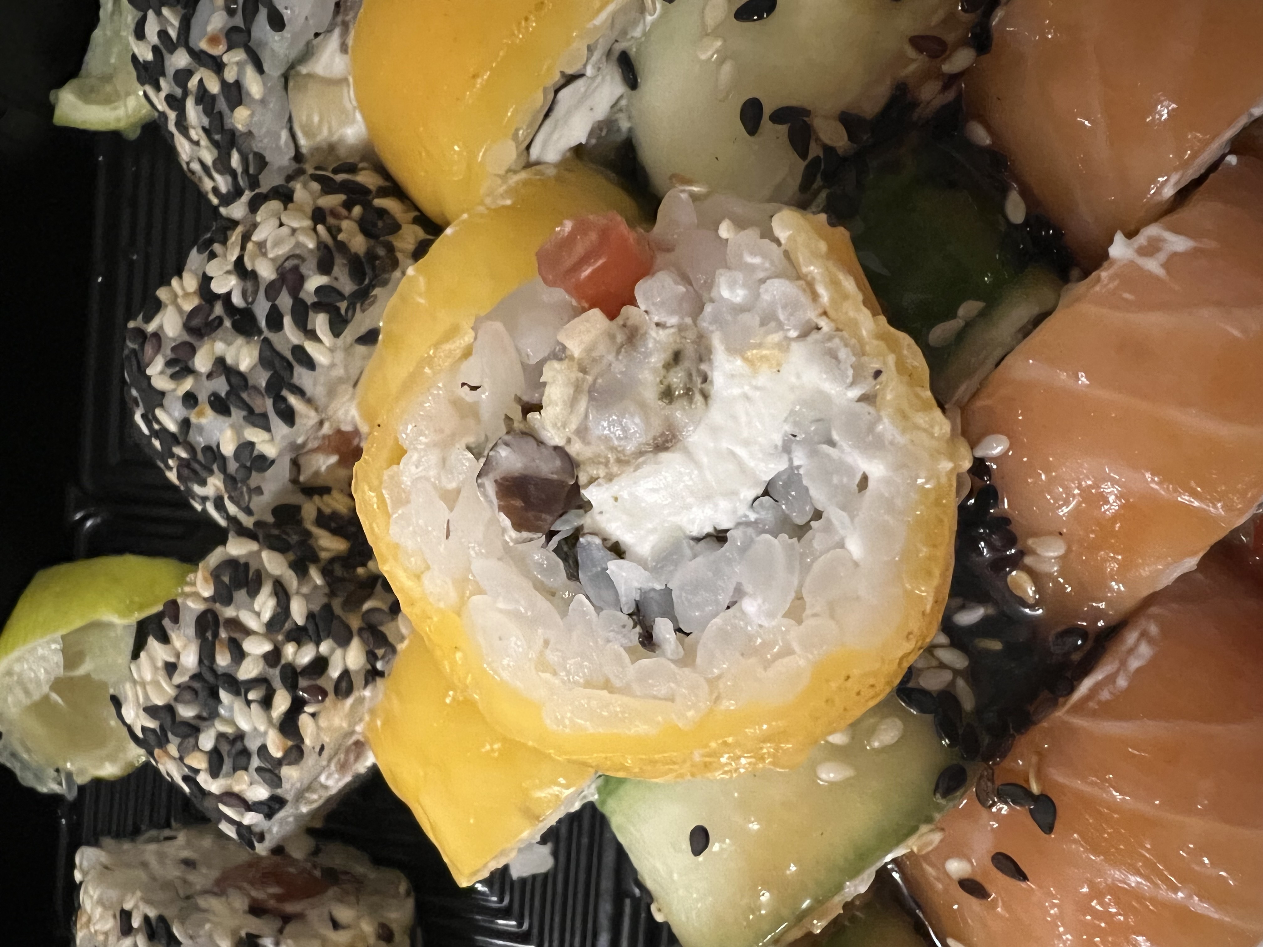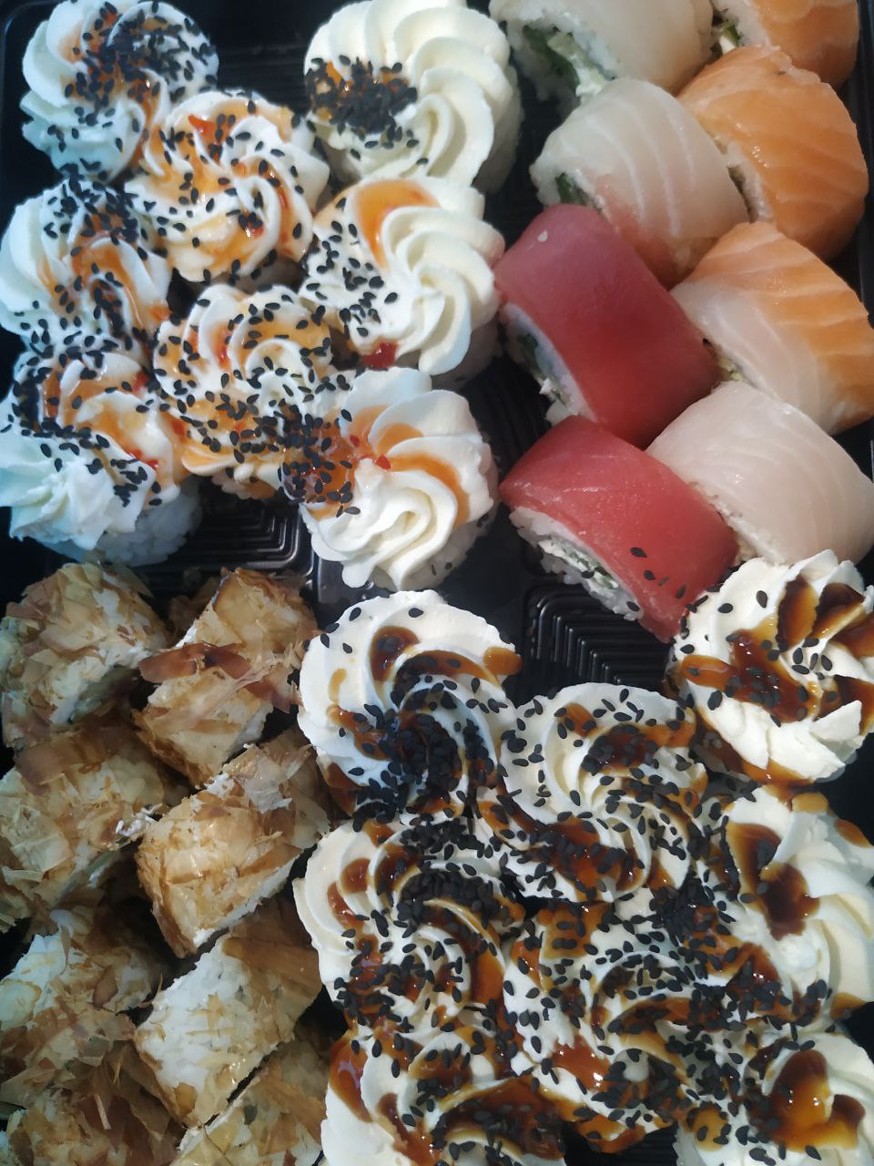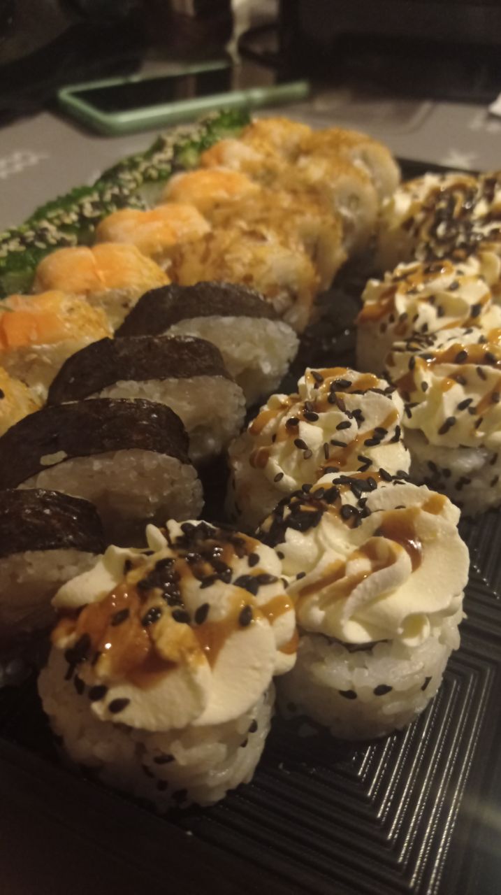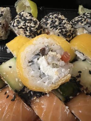 Состав: тунец, такуан, сыр, нори, рис, темпура