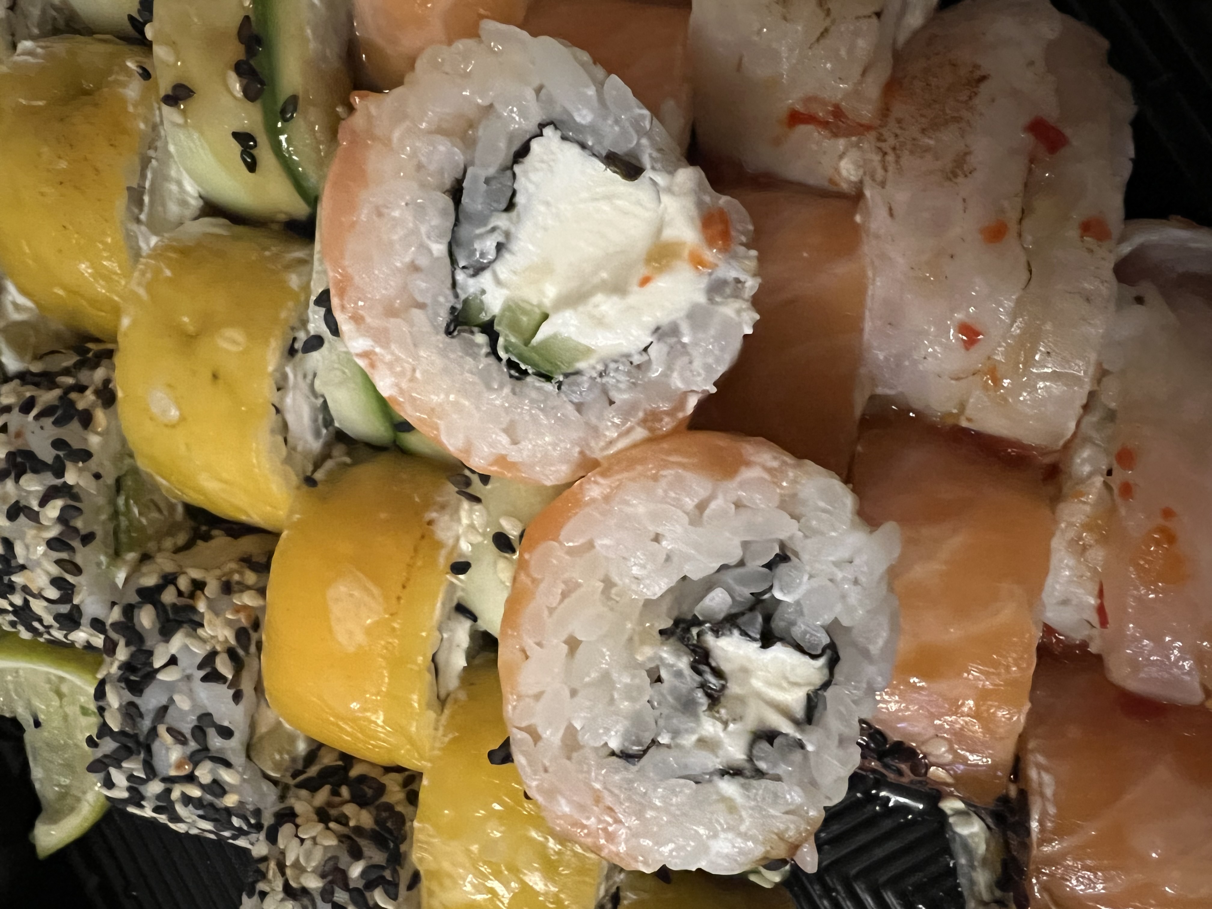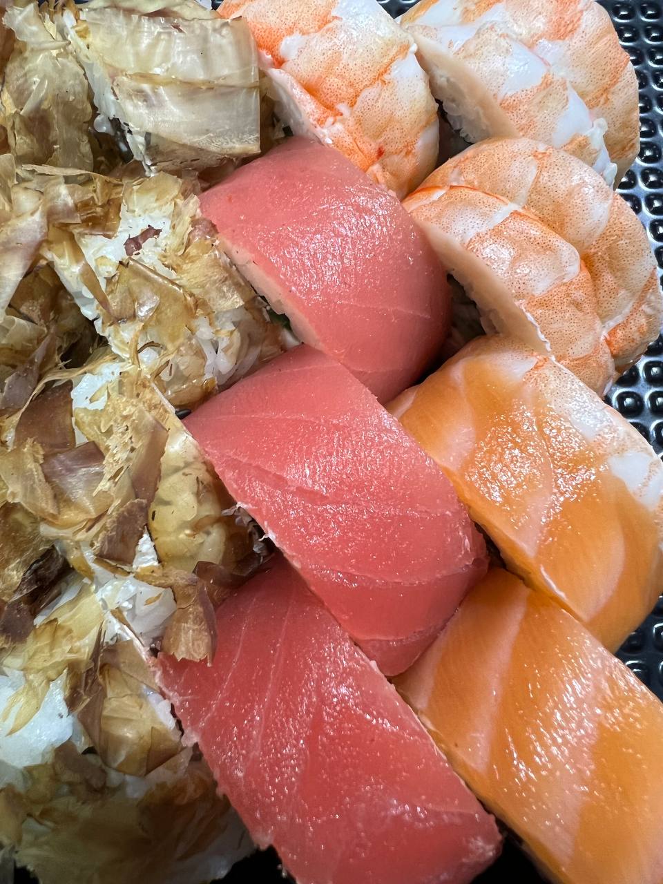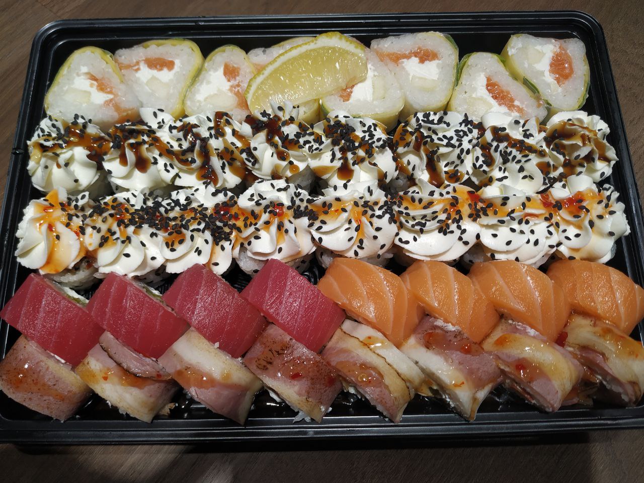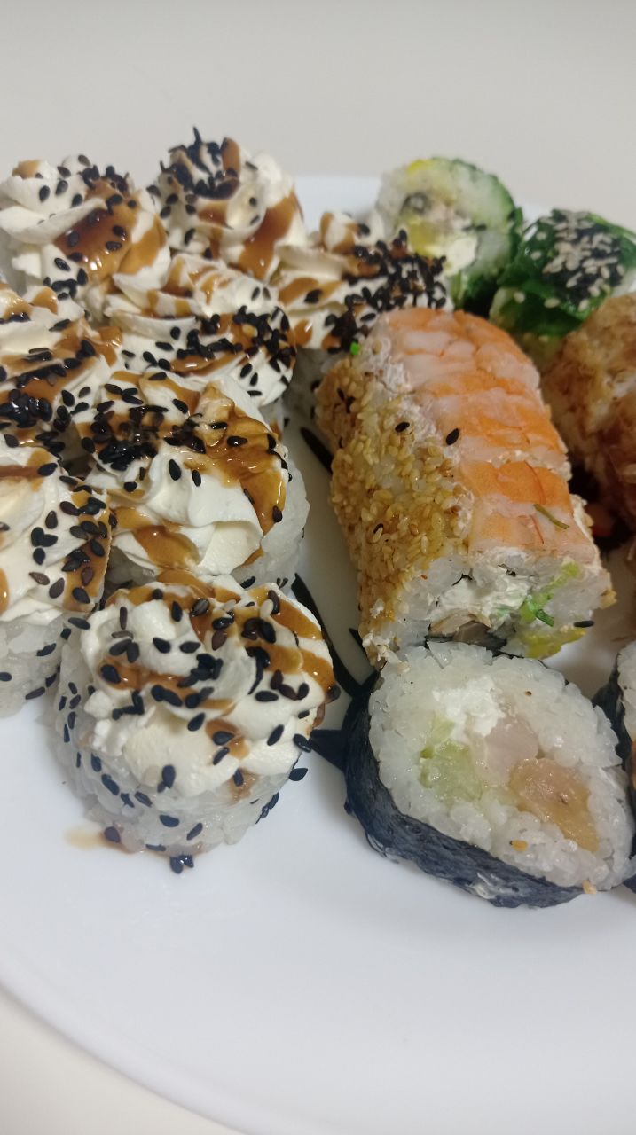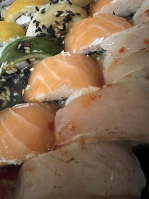 Состав: филе лосося, угорь, креветка тигровая, авокадо, огурец, сыр, рис, нори