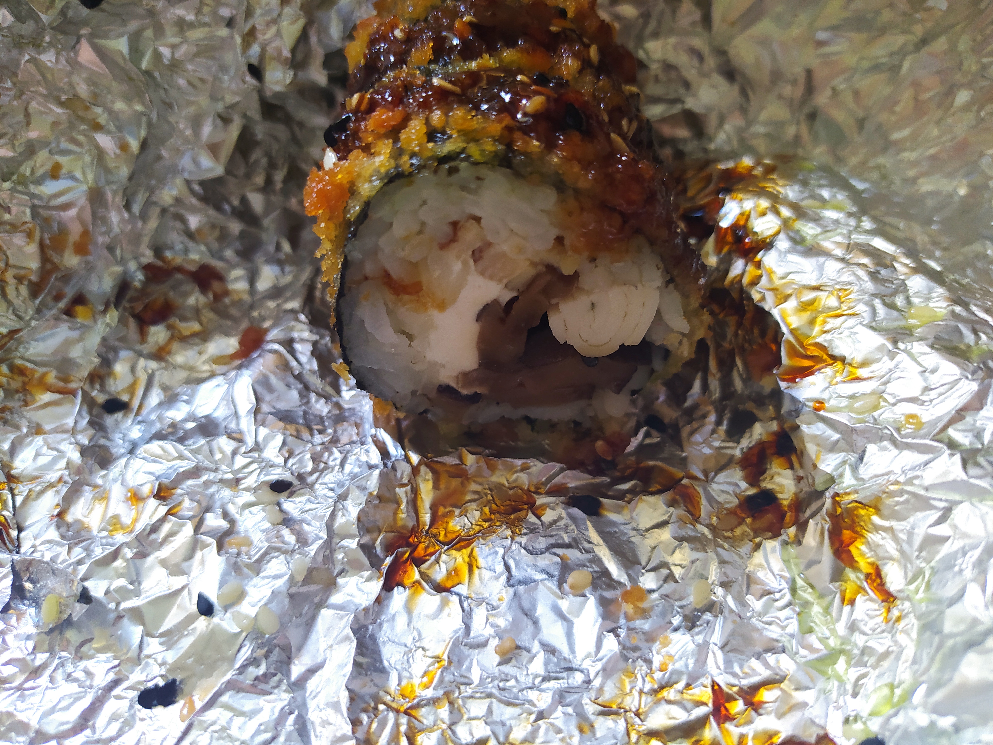 - ролл "Крем-шитаке в японском блинчике": грибы шиитаке, обжаренные в соусе терияки, крем-чиз, японский блинчик оранж, такуан, соус терияки, арахис, нори, рис - 8 шт.