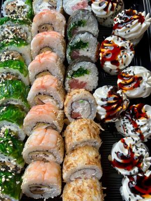 Состав: филе лосося, угорь, креветка тигровая, авокадо, огурец, сыр, рис, нори