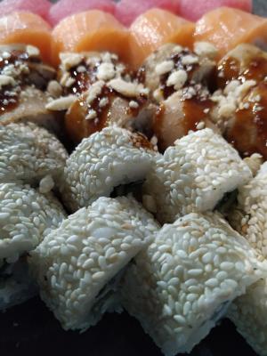 Состав: филе угря, авокадо, огурец, сыр, рис, соус терияки, кунжут