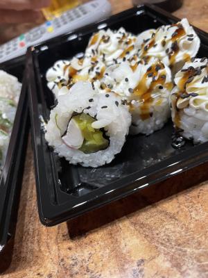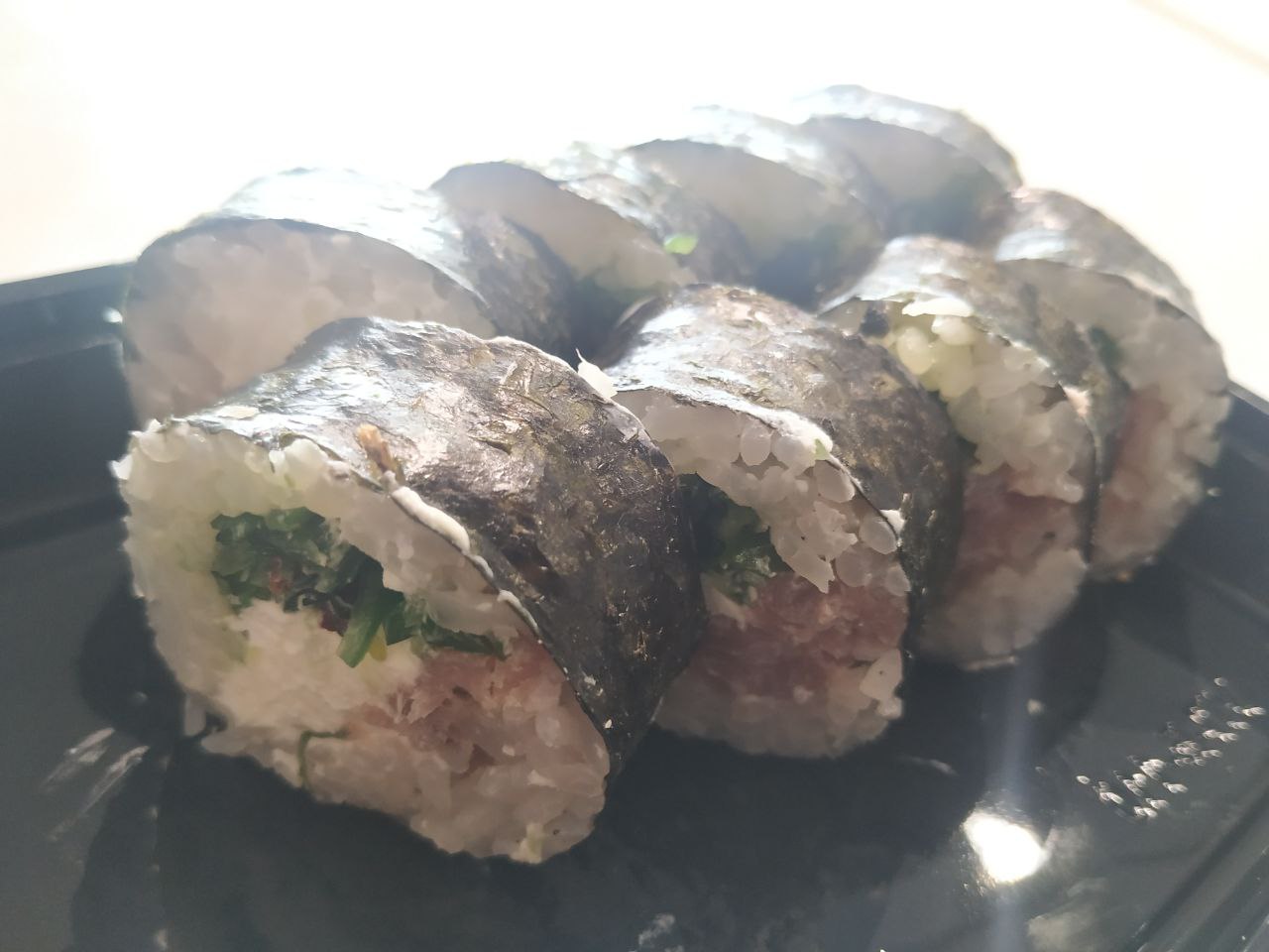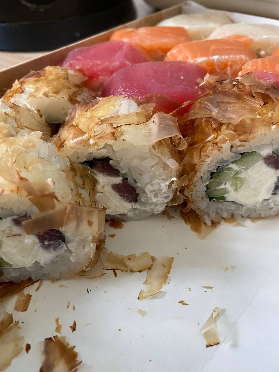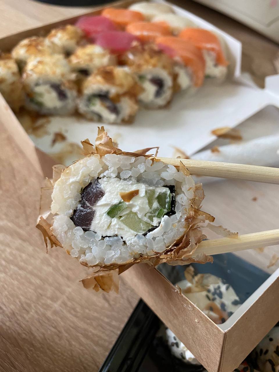 Состав: тунец, такуан, сыр, нори, рис, темпура