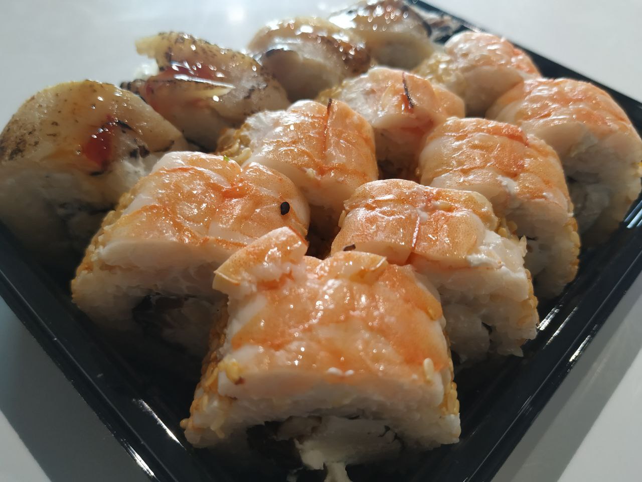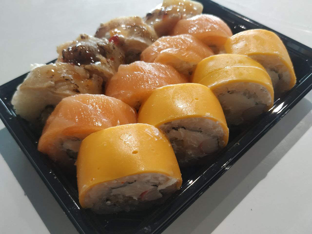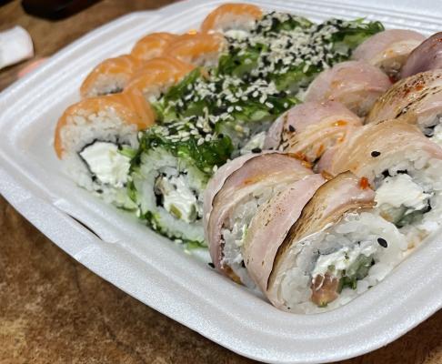 Состав: филе лосося, угорь, креветка тигровая, авокадо, огурец, сыр, рис, нори