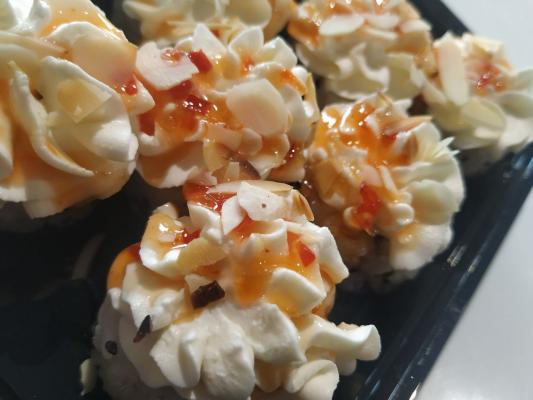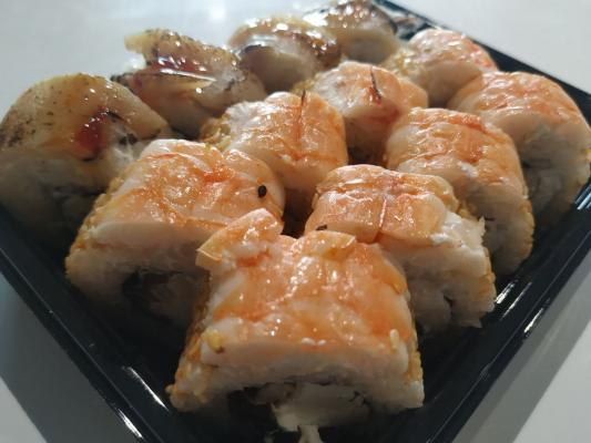 - ролл "Мидии терияки под сырной шапочкой": мидии, морковь терияки, кунжут, крем-сыр, соус терияки, нори, рис - 8 шт.