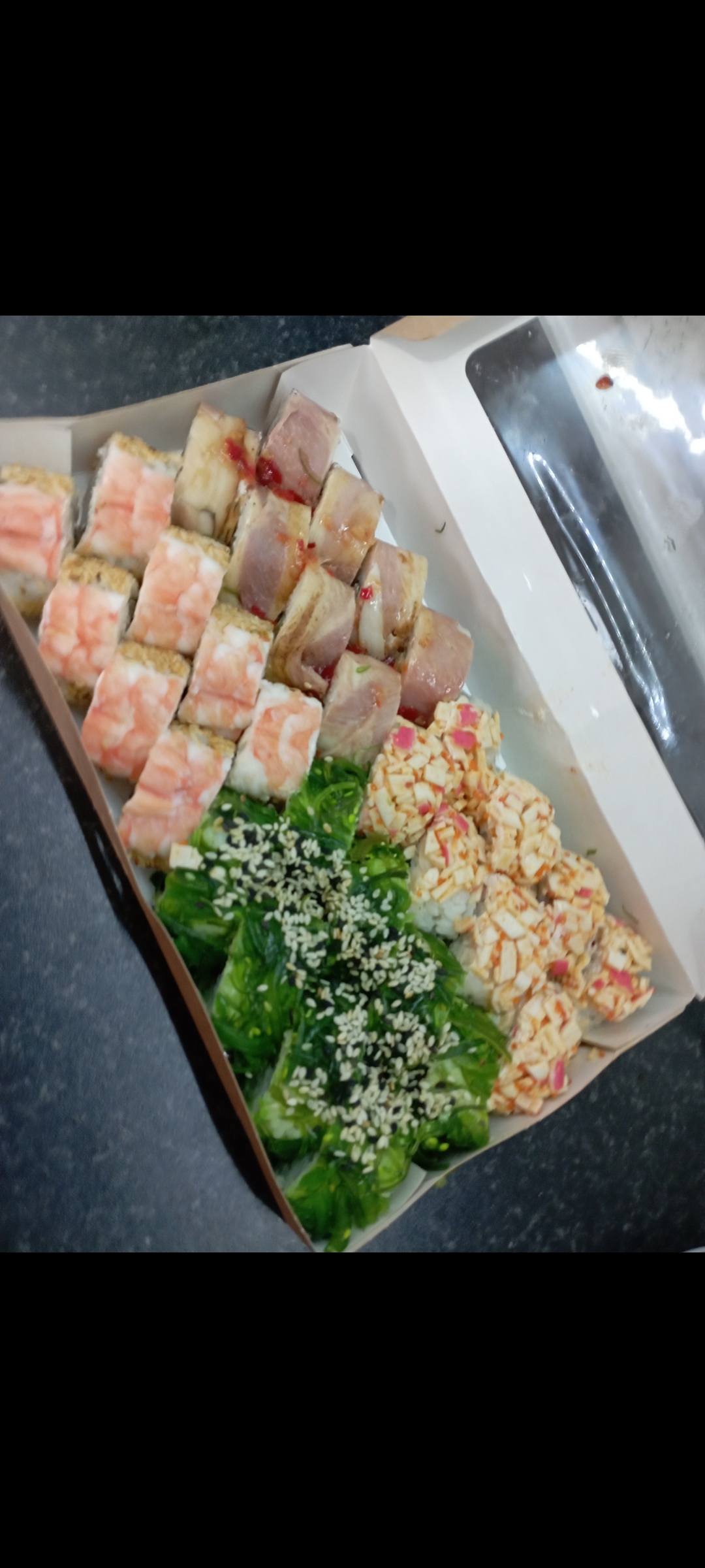 Состав: филе лосося, угорь, креветка тигровая, авокадо, огурец, сыр, рис, нори