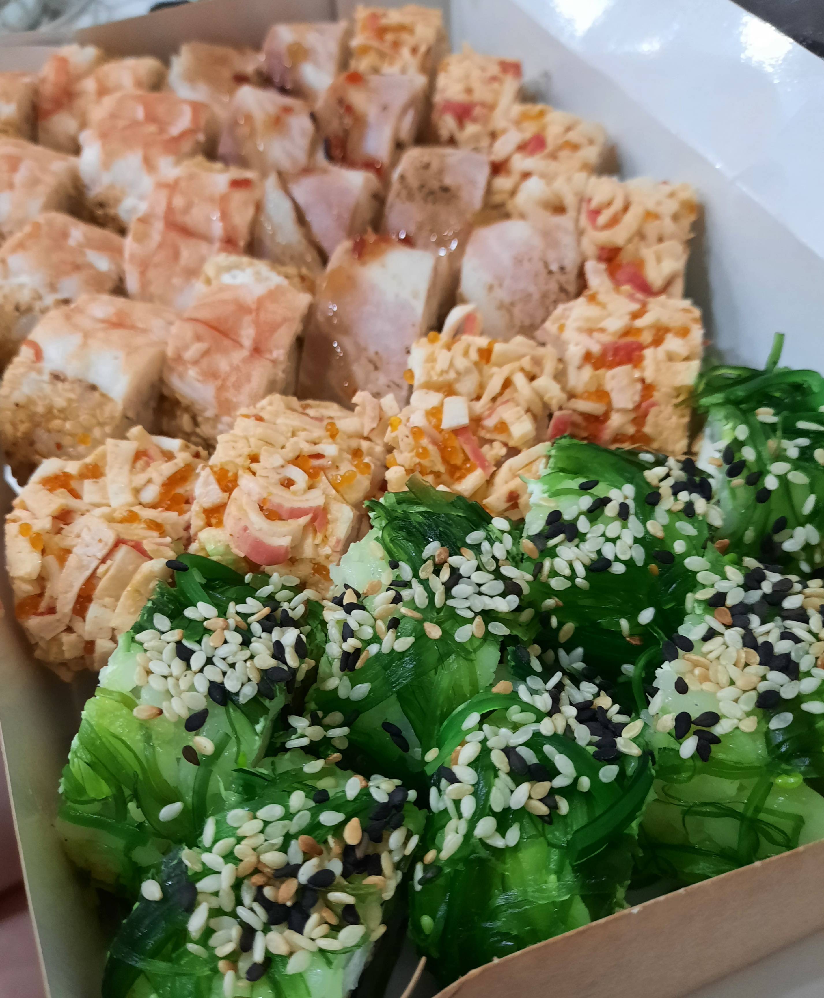 - ролл "Грин Эби Кроунинг": креветка тигровая, краб-микс, чука-салат, сыр, кунжут, нори, рис - 8 шт.