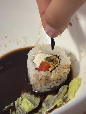 - ролл "Крем-шитаке в японском блинчике": грибы шиитаке, обжаренные в соусе терияки, крем-чиз, японский блинчик оранж, такуан, соус терияки, арахис, нори, рис - 8 шт.