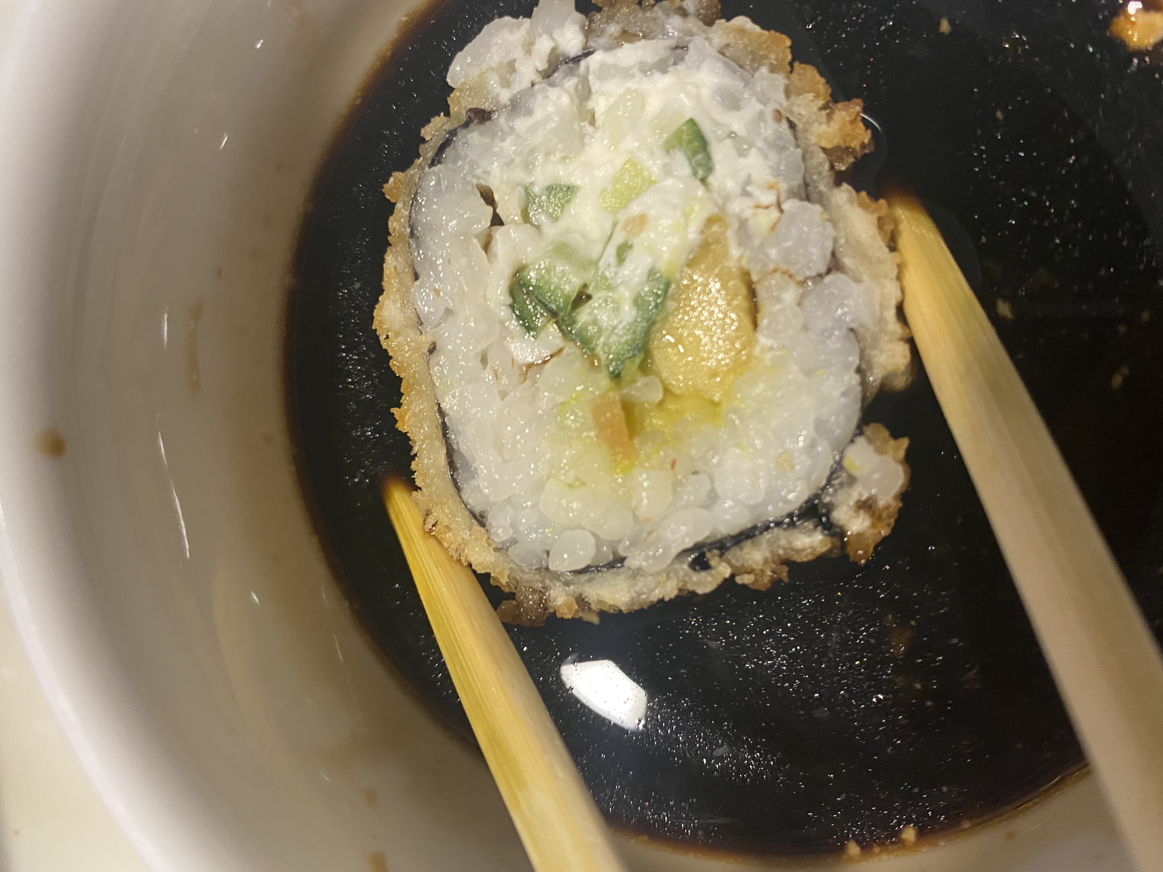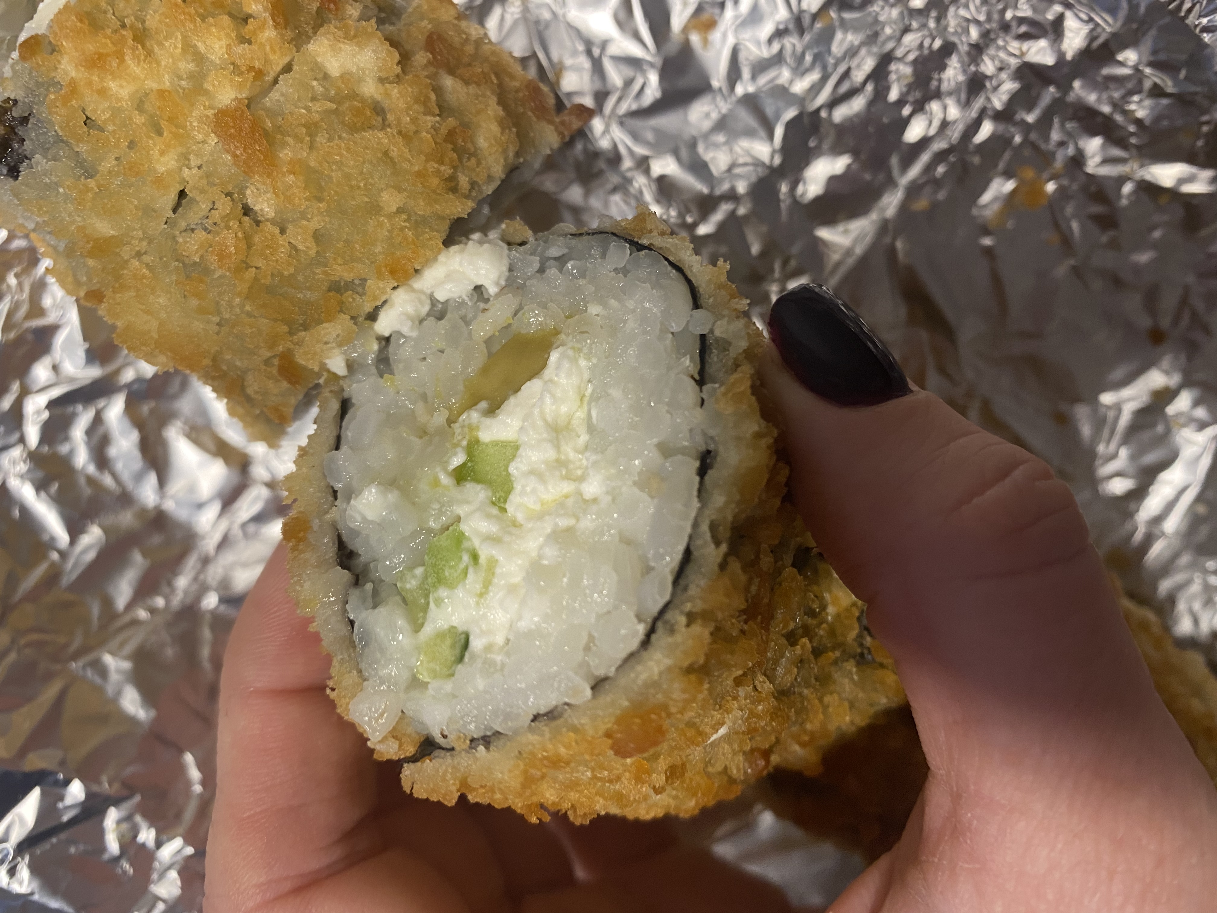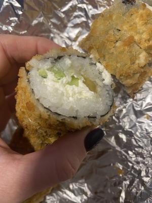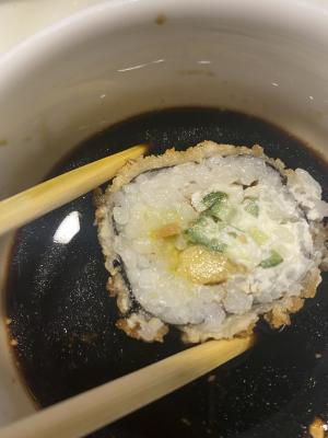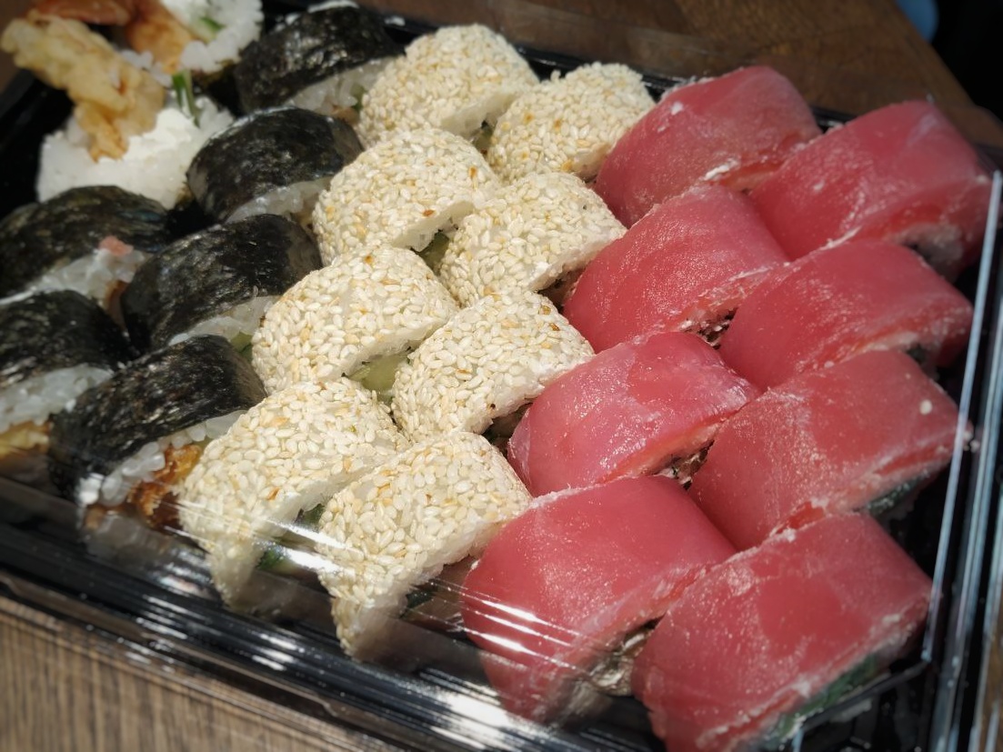 Состав: тунец, такуан, сыр, нори, рис, темпура