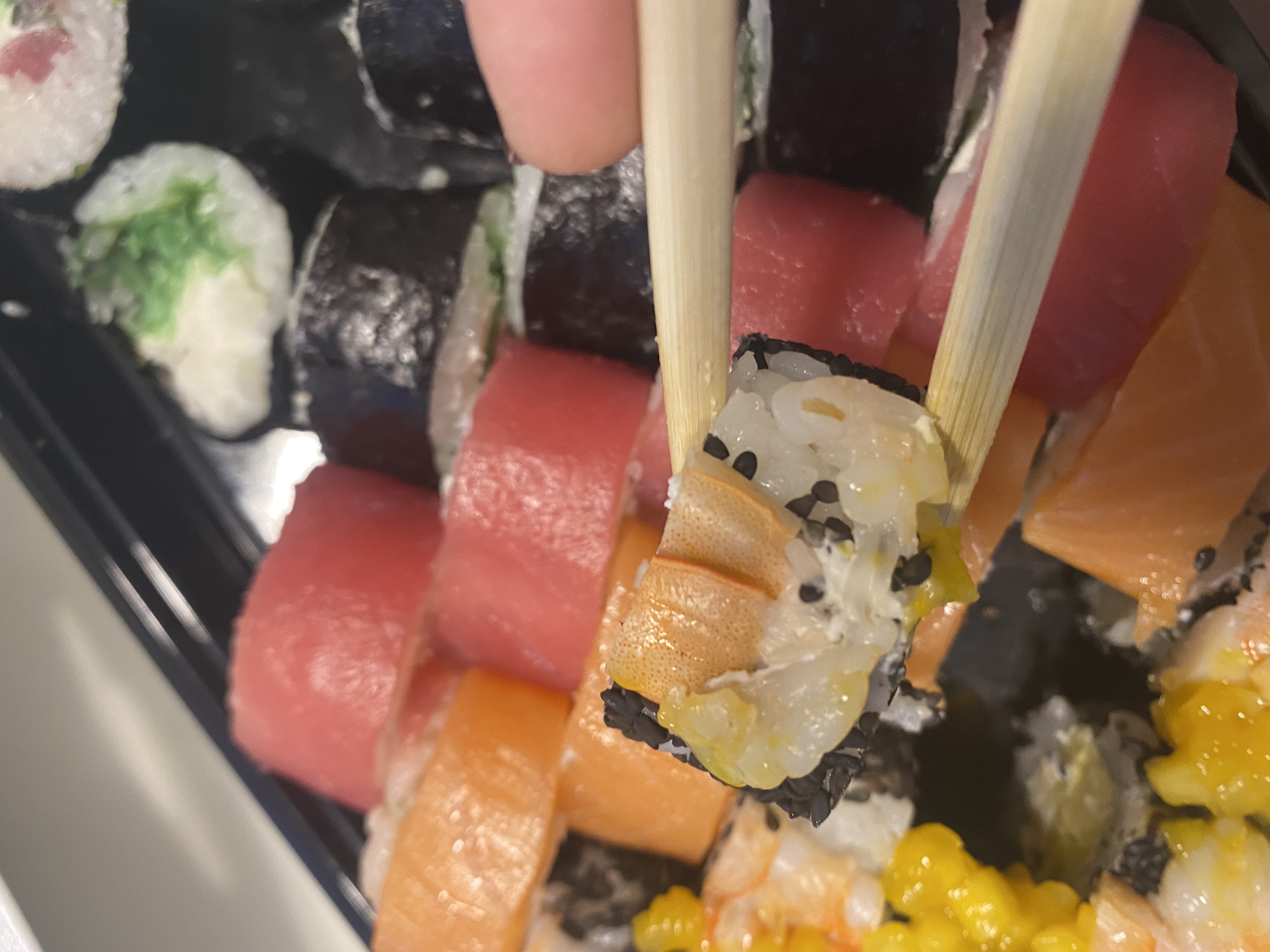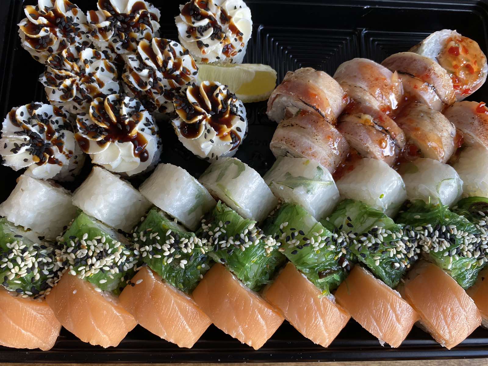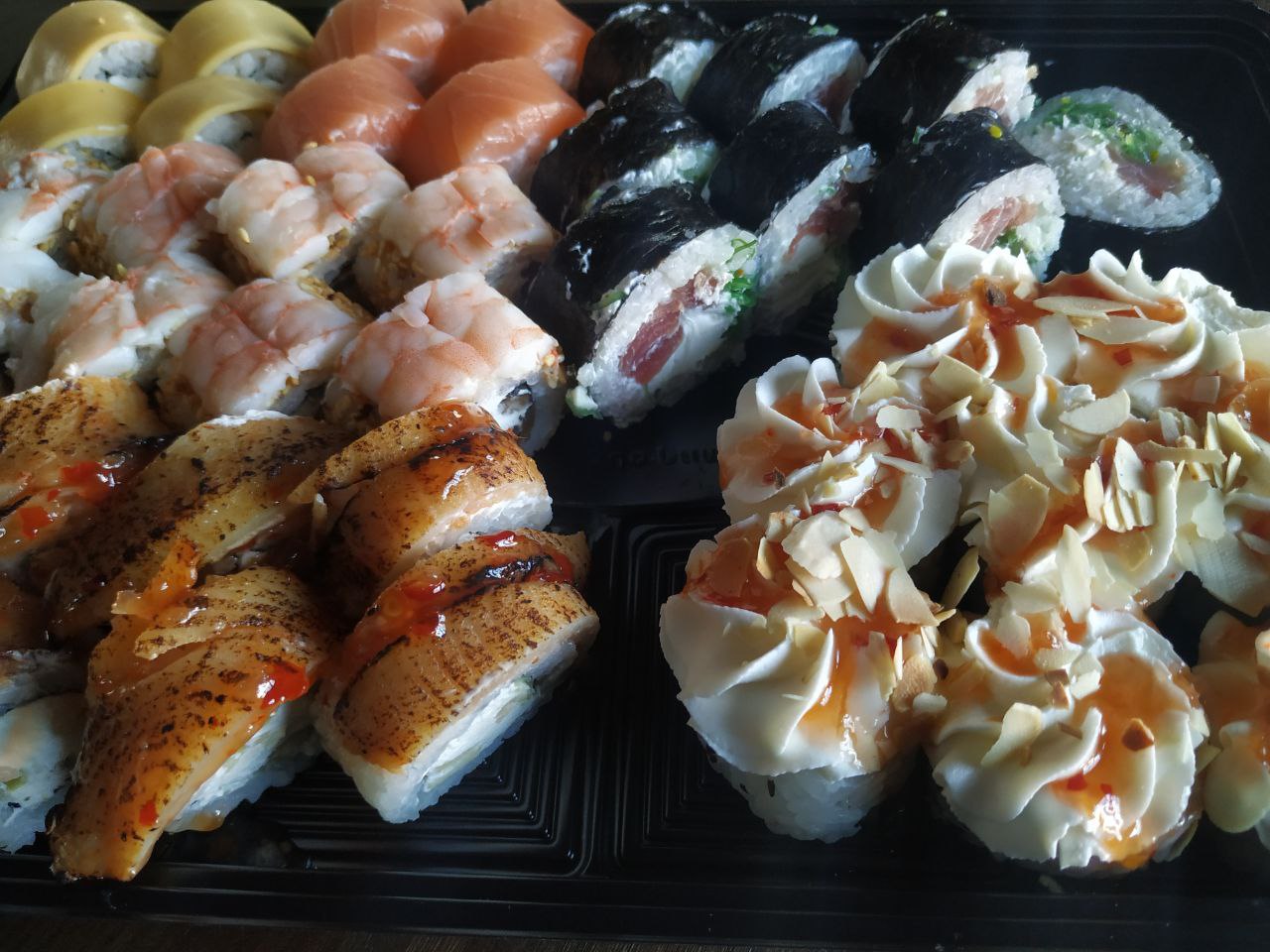 Состав: филе лосося, угорь, креветка тигровая, авокадо, огурец, сыр, рис, нори
