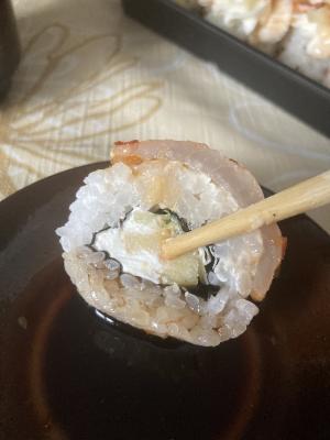 Состав: тигровая креветка, авокадо, огурец, сыр, рис, нори