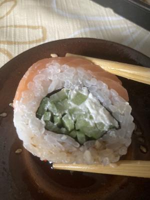 Состав: филе лосося, огурец, сыр, рис, нори
