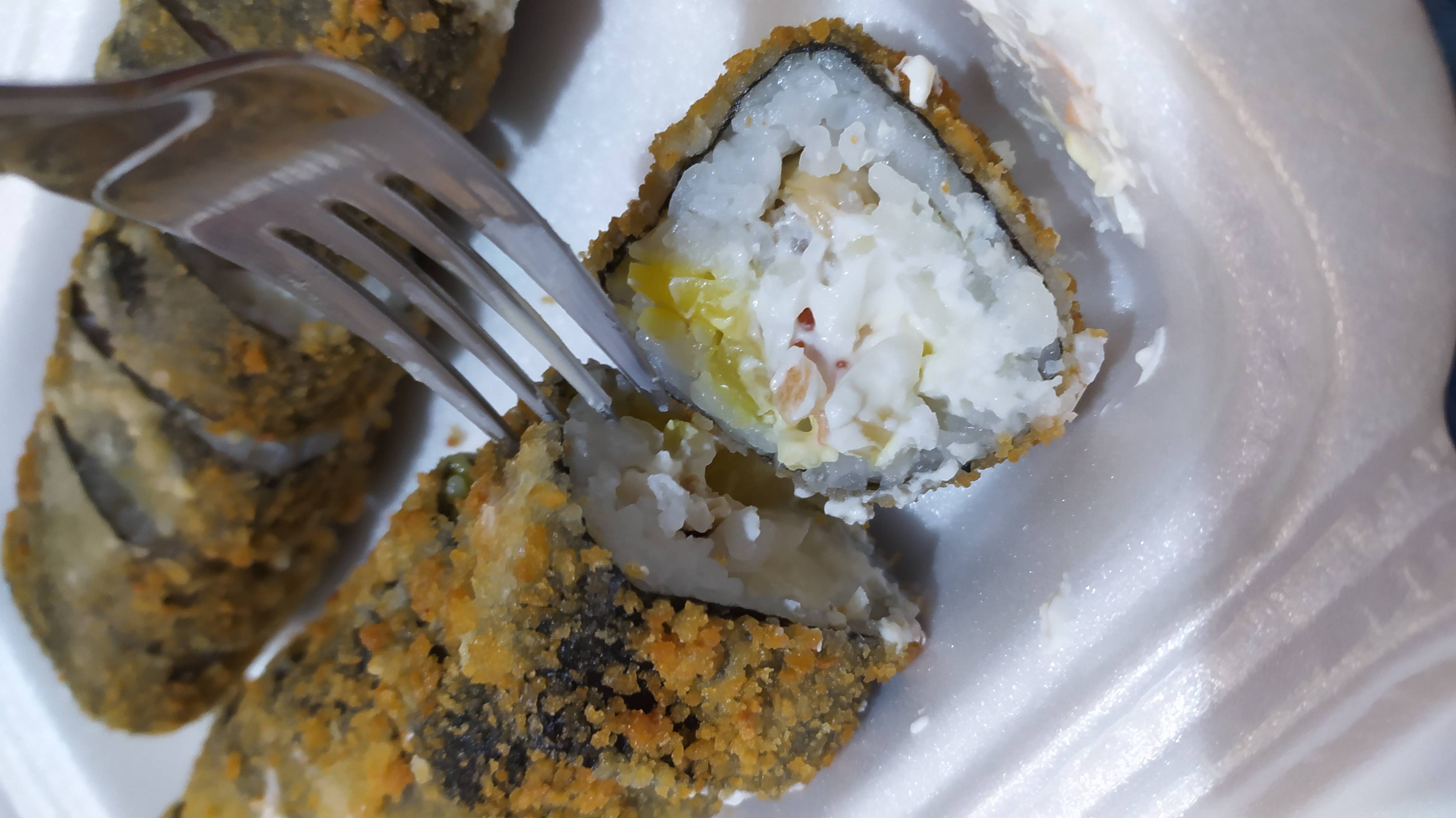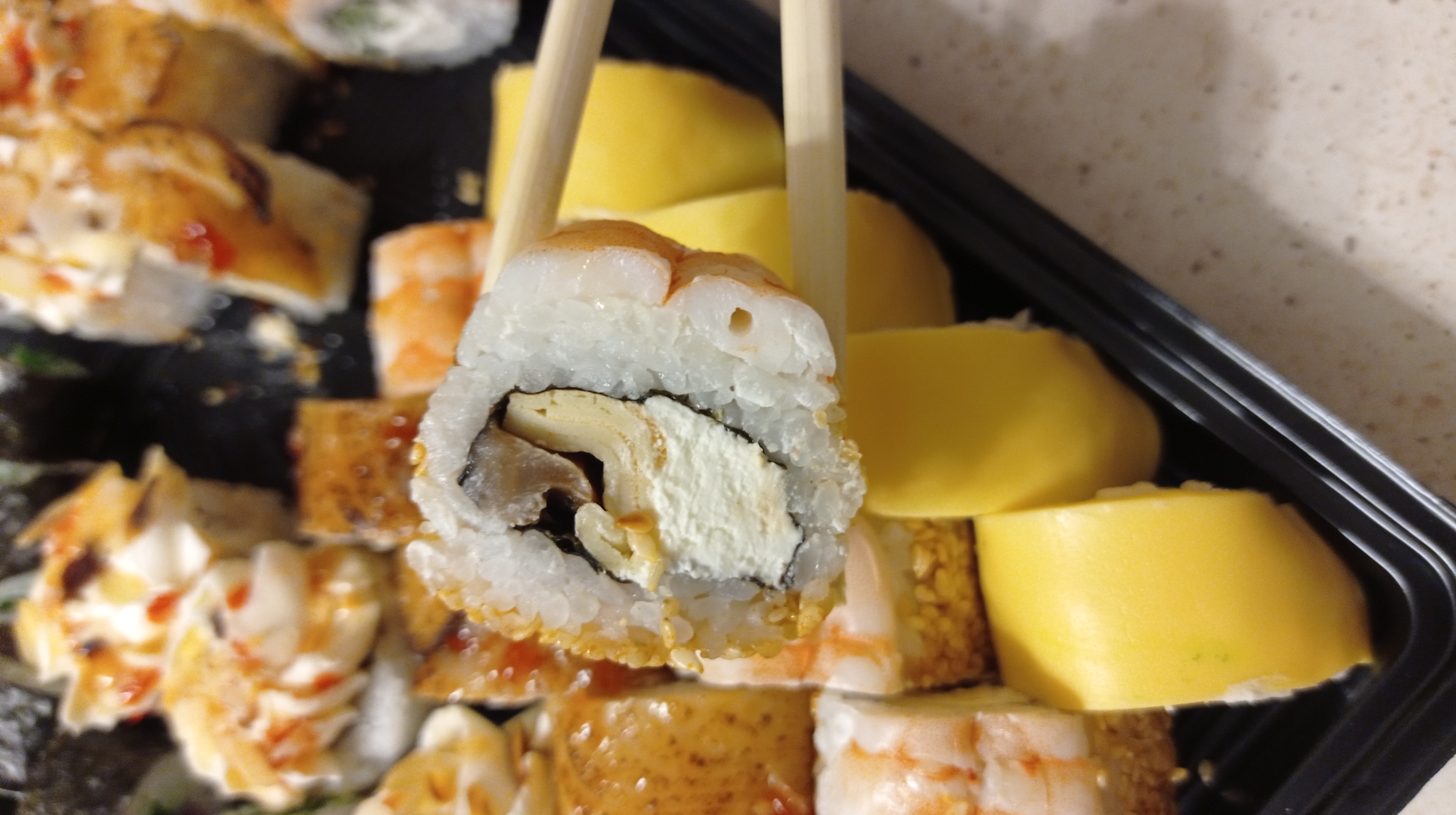 Состав: тунец, такуан, сыр, нори, рис, темпура