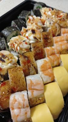 Состав: филе лосося, угорь, креветка тигровая, авокадо, огурец, сыр, рис, нори