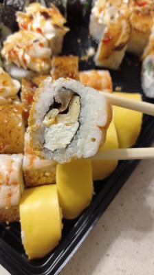 - ролл "Крем-шитаке в японском блинчике": грибы шиитаке, обжаренные в соусе терияки, крем-чиз, японский блинчик оранж, такуан, соус терияки, арахис, нори, рис - 8 шт.