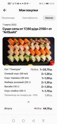 - Промокод дает право на скидку до 61% на суши-сеты от "ArtSushi"
