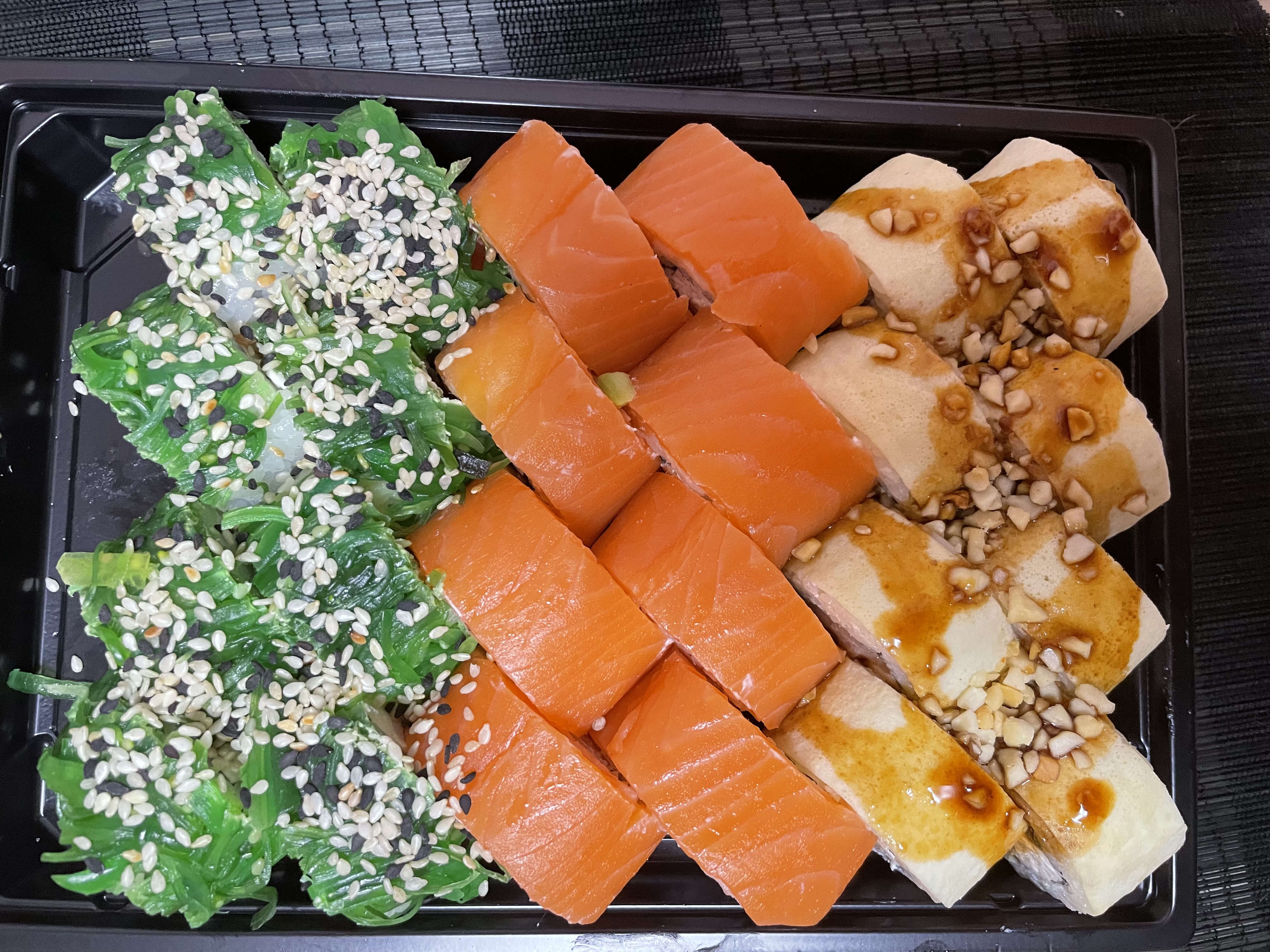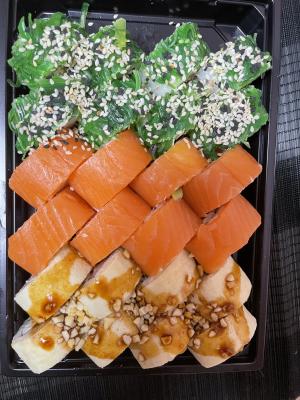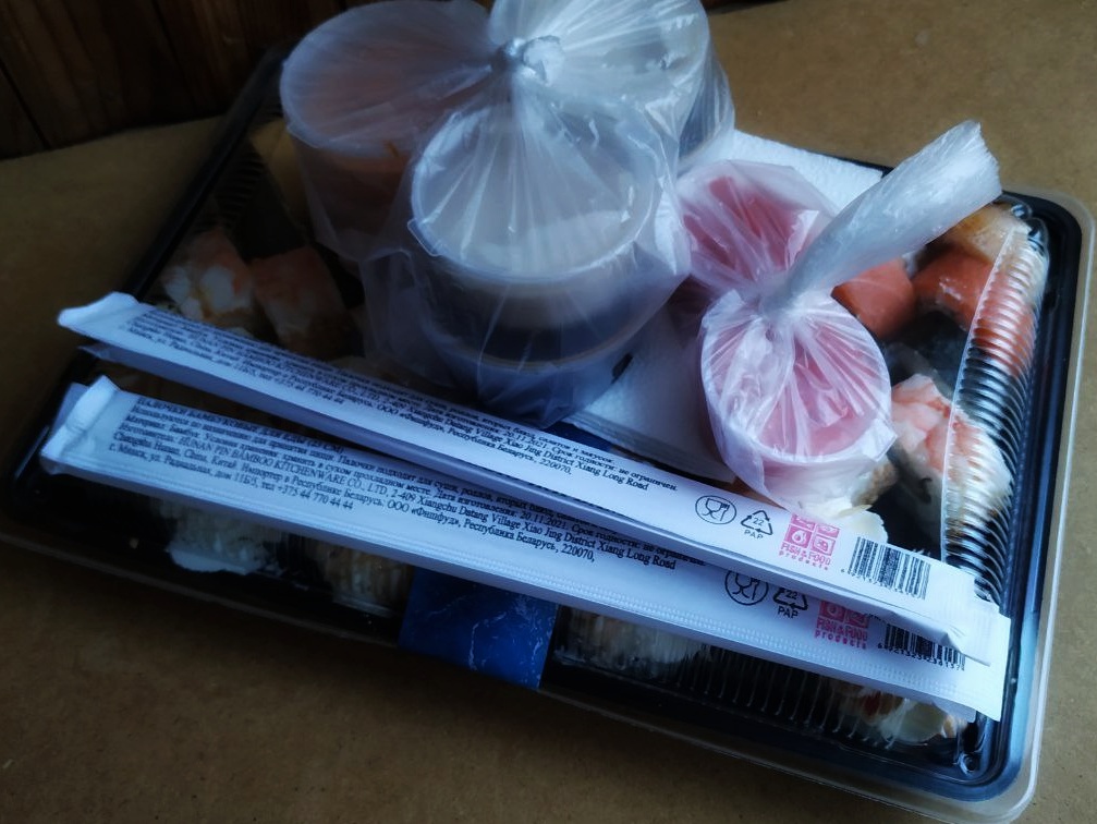 - гарнир: имбирь (25 г), соевый соус (40 мл), васаби (15 г) в подарок!