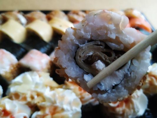 - ролл "Крем-шитаке в японском блинчике": грибы шиитаке, обжаренные в соусе терияки, крем-чиз, японский блинчик оранж, такуан, соус терияки, арахис, нори, рис - 8 шт.