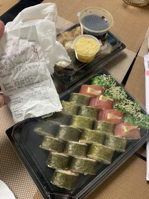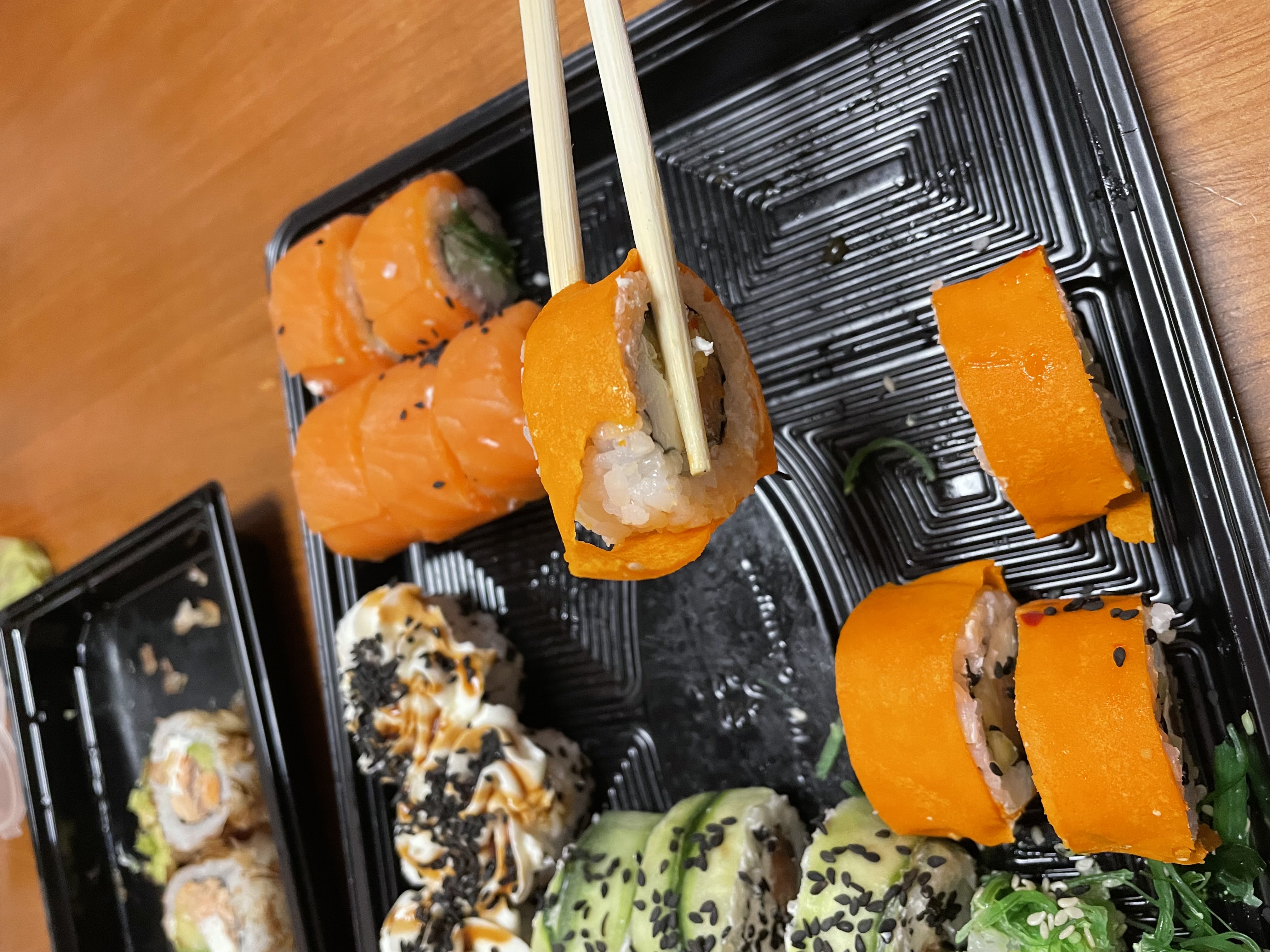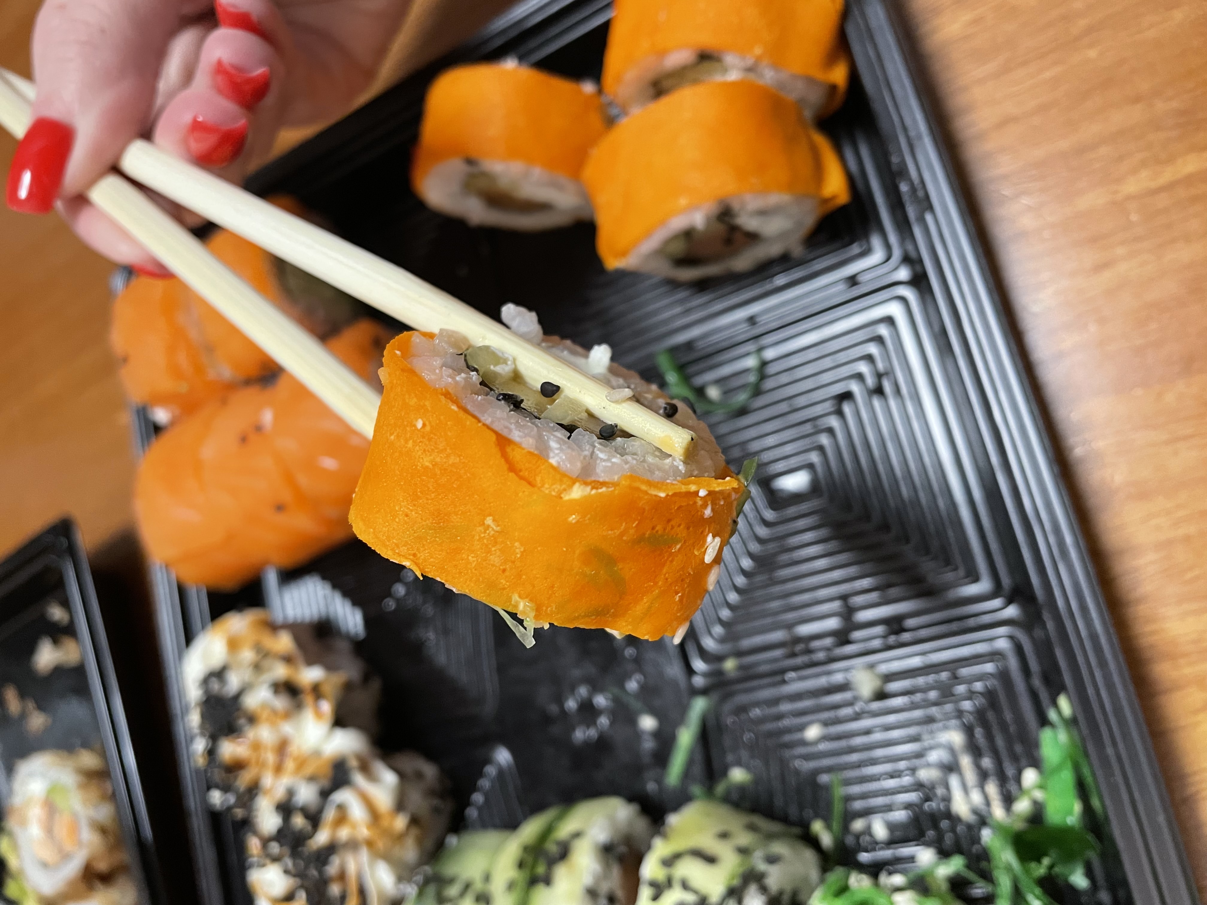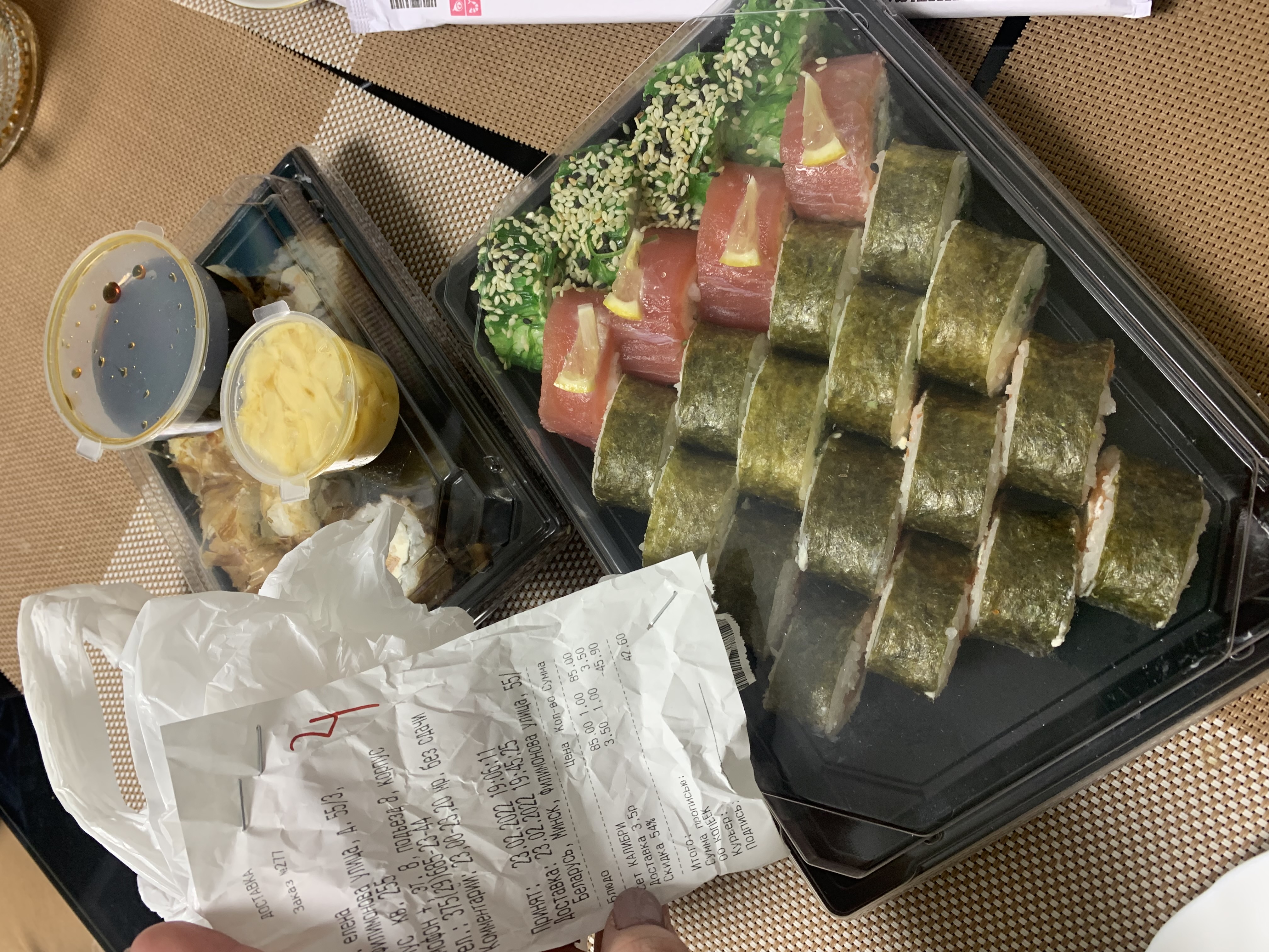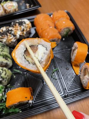 Забирала вчера самовывозом с Кальварийской. Суши были готовы вовремя. Очень свежие, не разваливались, рыбы много. Вкусные и сытные 😍 суперские! Остались с мужем довольны!