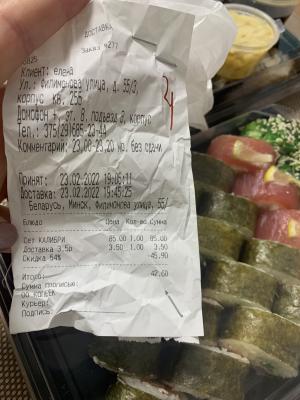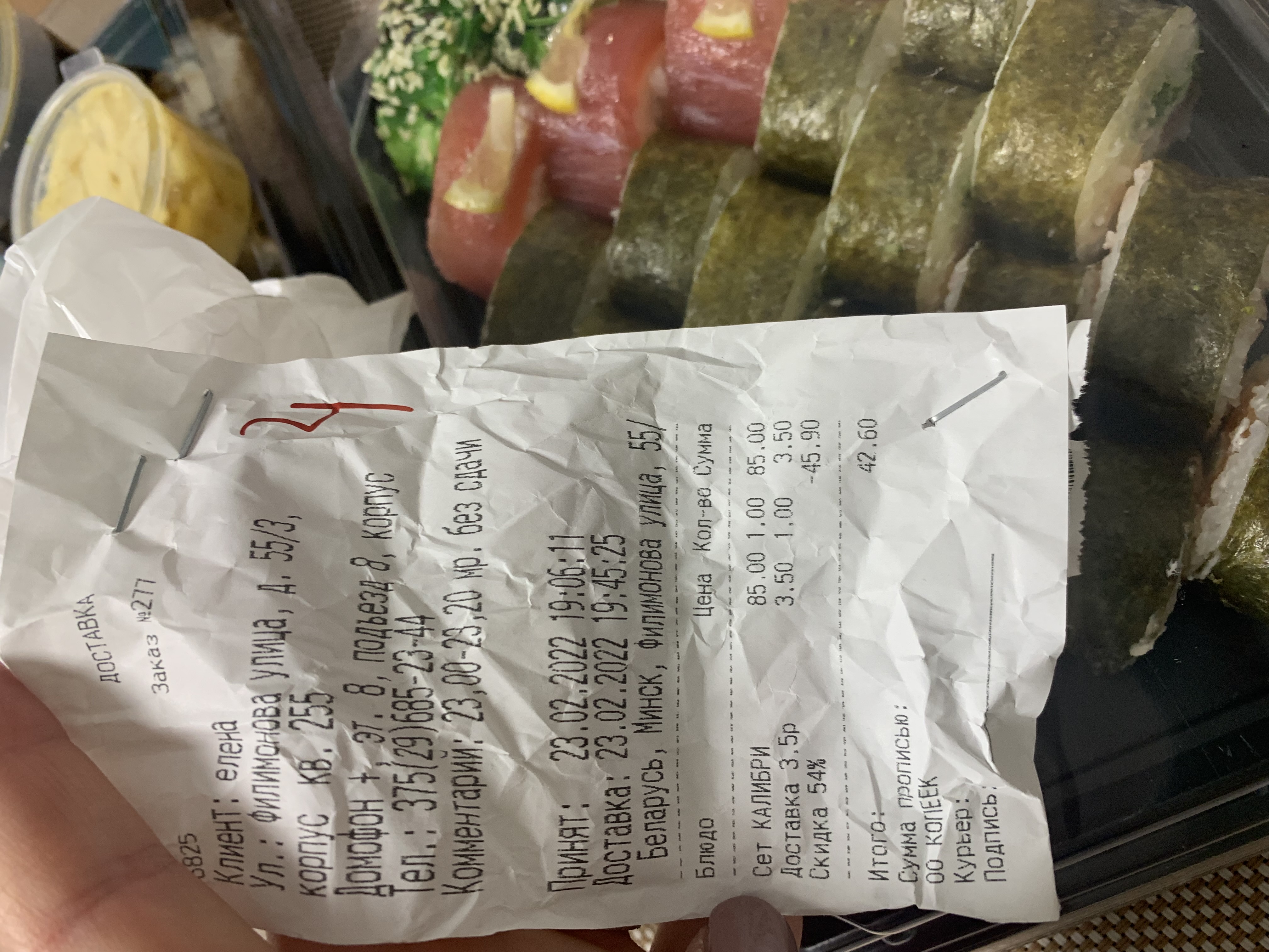 МЫ НЕГОДОВАЛИ! Праздник был испорчен. Обычно проблем нет, поэтому и согласились на долгую и платную доставку. Какое же разочарование наступило, когда в 23:00 привезли НЕ НАШ ЗАКАЗ. Суши сет маленький, невкусный и дешёвый. (Разница с нашим любимым и оплаченным «Калибри» около 15-20 рублей). Неприятно.