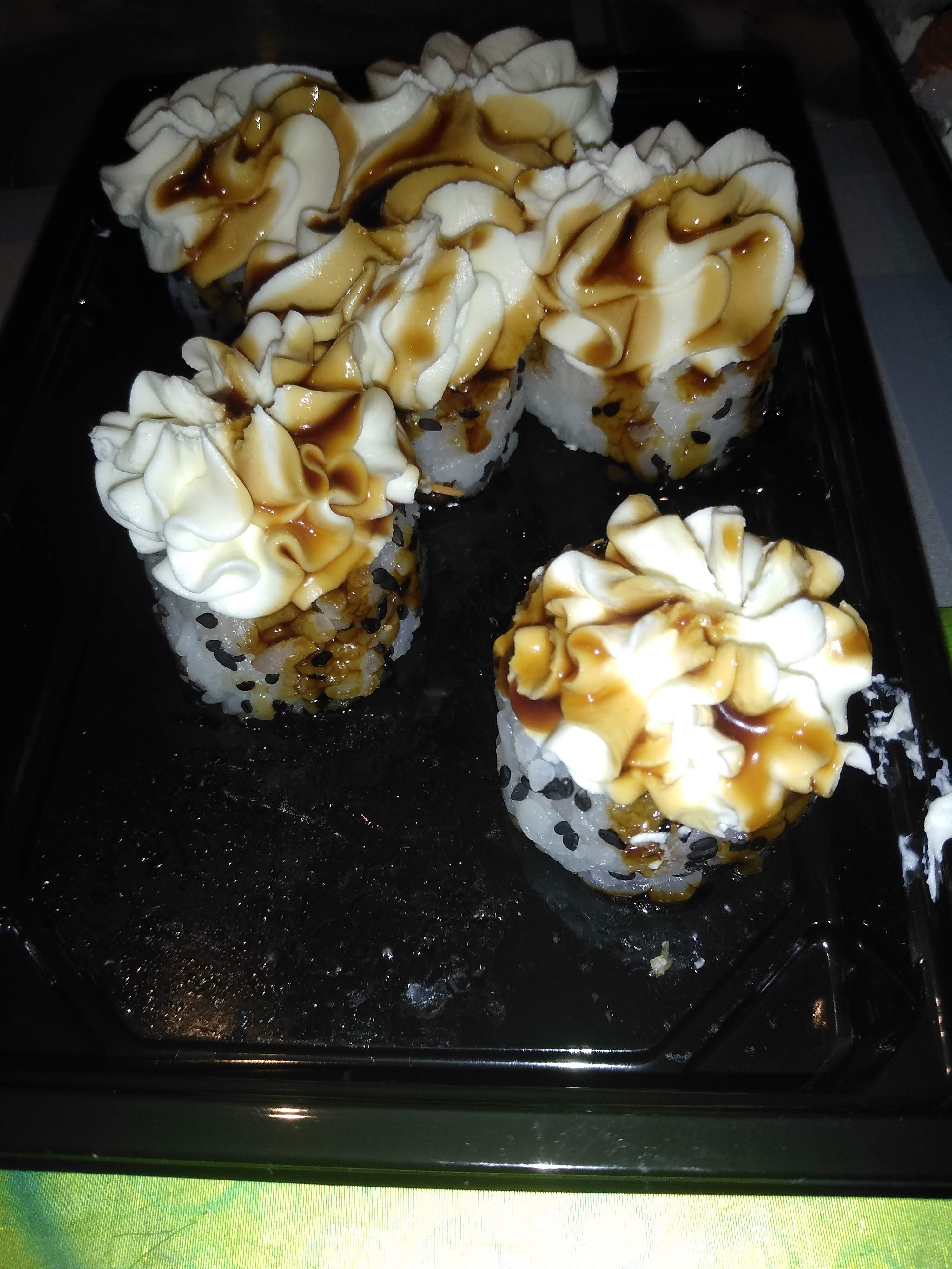 Состав: филе угря, авокадо, огурец, сыр, рис, соус терияки, кунжут