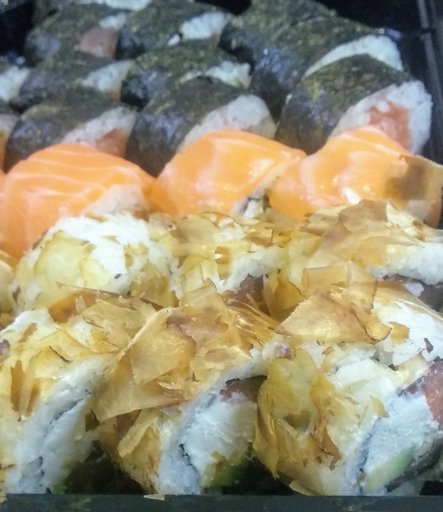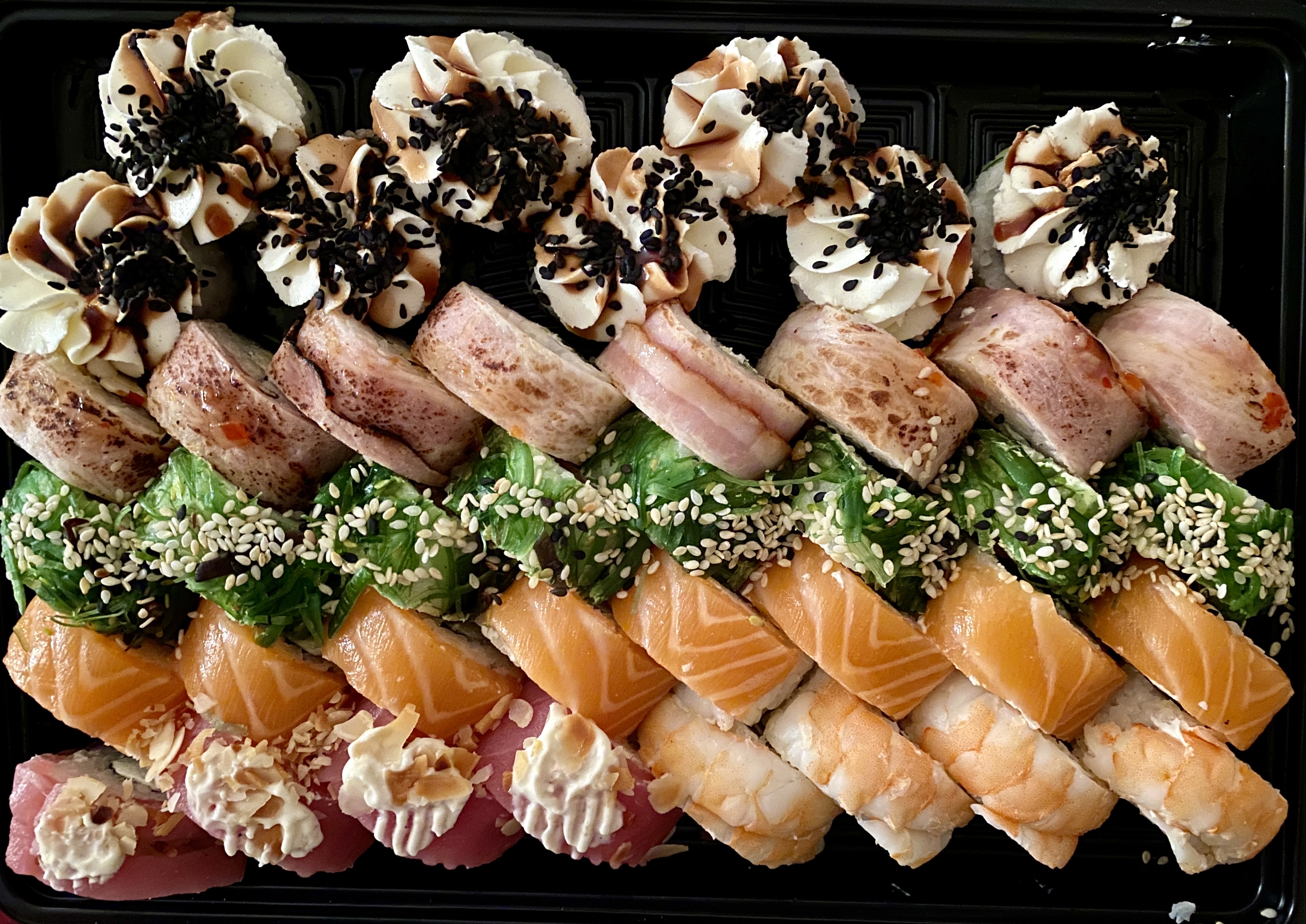 Состав: филе лосося, угорь, креветка тигровая, авокадо, огурец, сыр, рис, нори