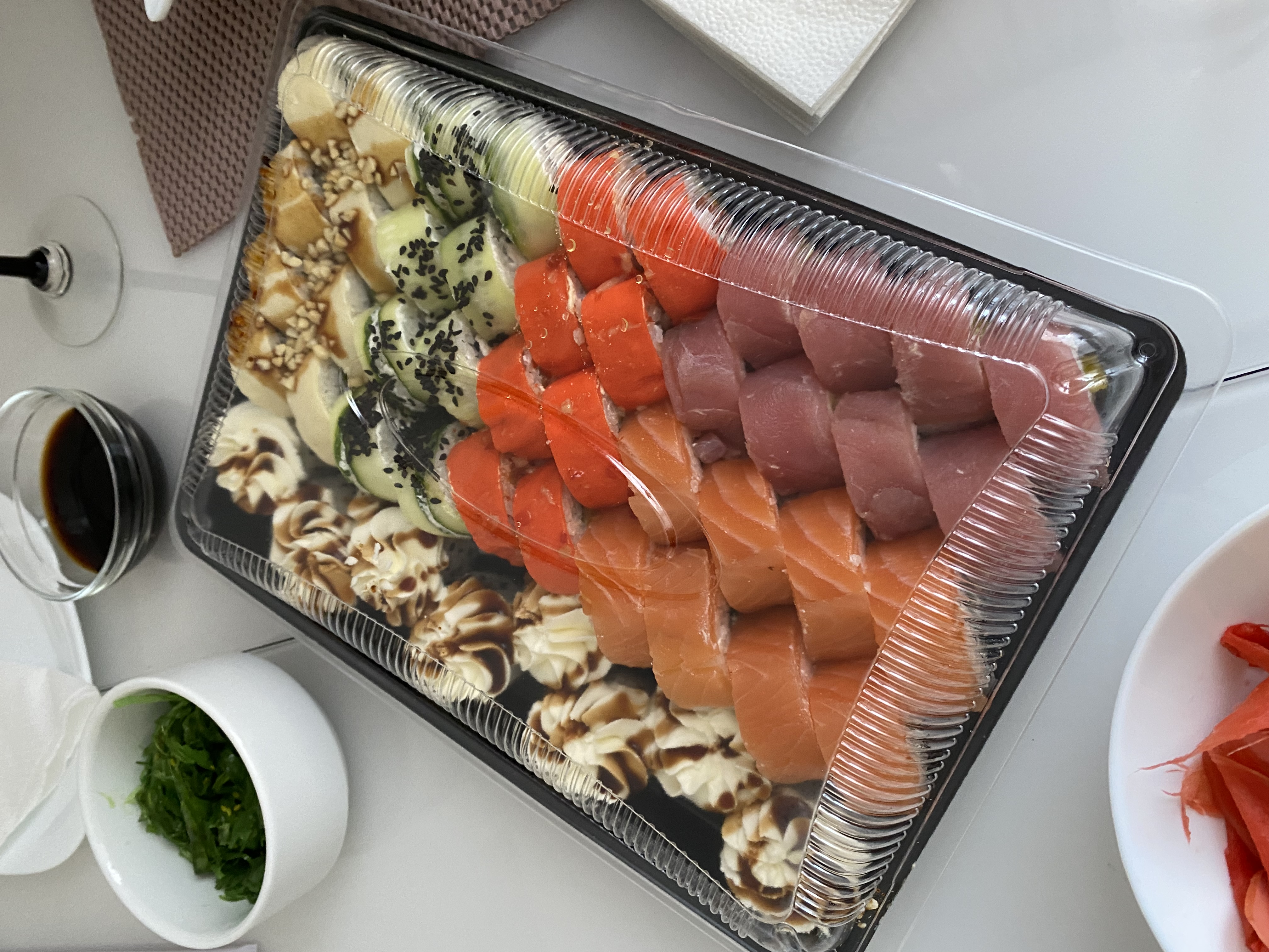 - гарнир: имбирь (25 г), соевый соус (40 мл), васаби (15 г) в подарок!