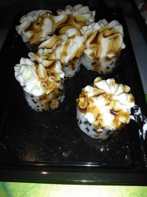 - ролл "Мидии терияки под сырной шапочкой": мидии, морковь терияки, кунжут, крем-сыр, соус терияки, нори, рис - 8 шт.