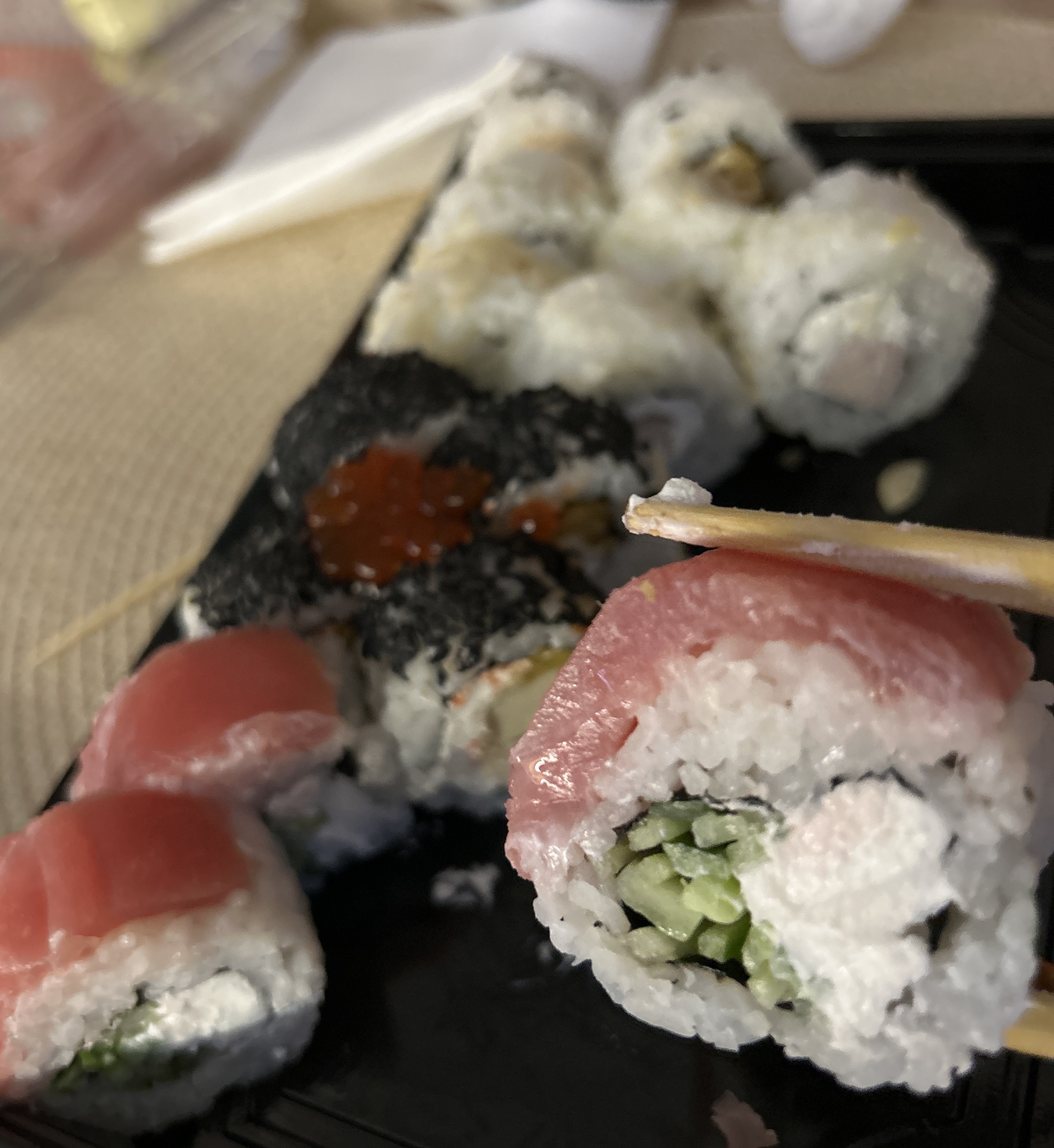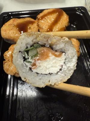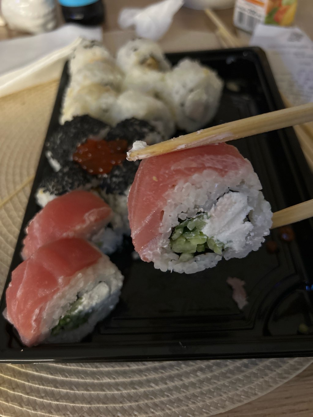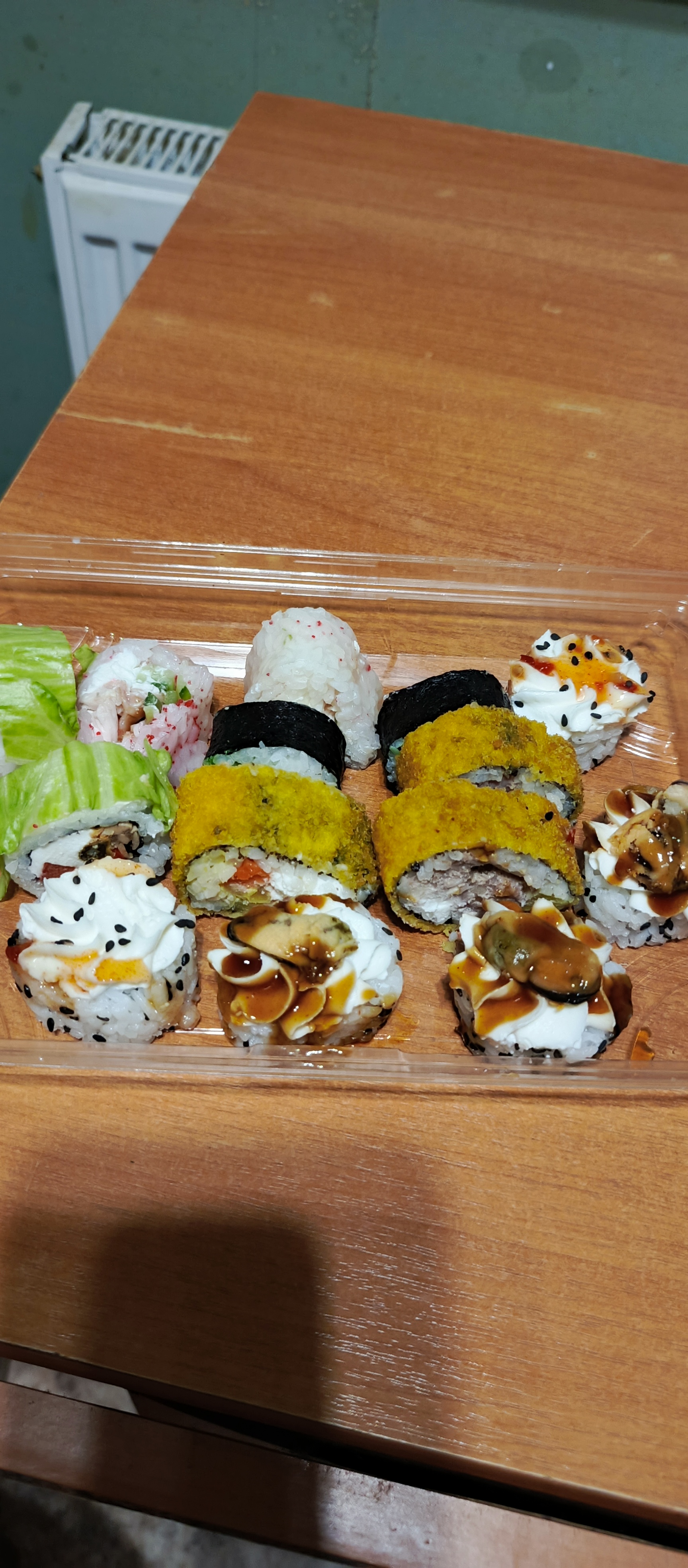 Состав: тунец, такуан, сыр, нори, рис, темпура