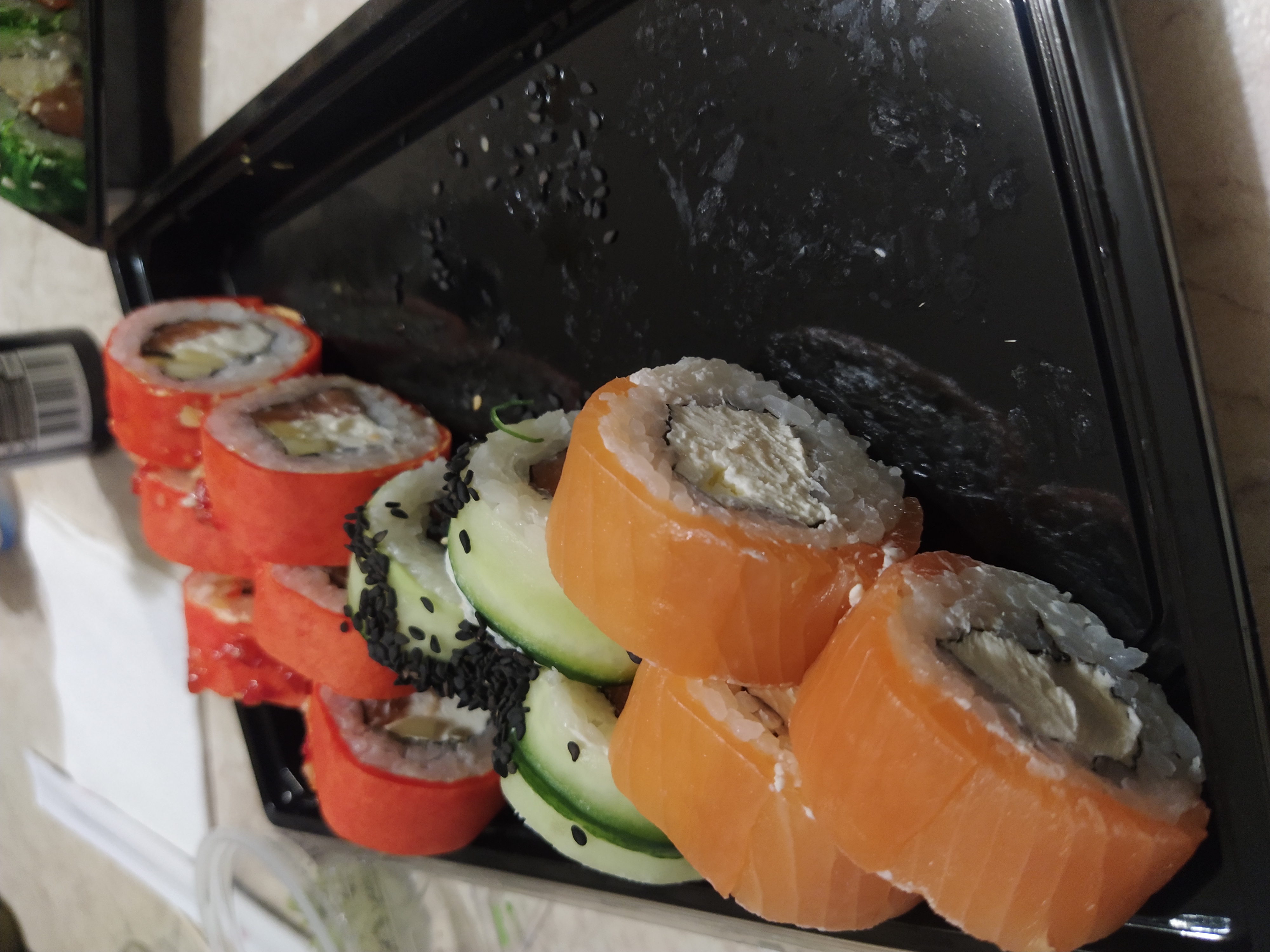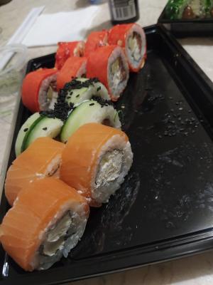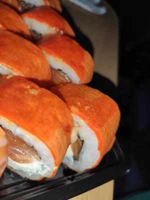 Состав: филе лосося, угорь, креветка тигровая, авокадо, огурец, сыр, рис, нори