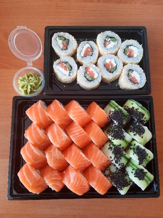 - гарнир: имбирь (25 г), соевый соус (40 мл), васаби (15 г) в подарок!