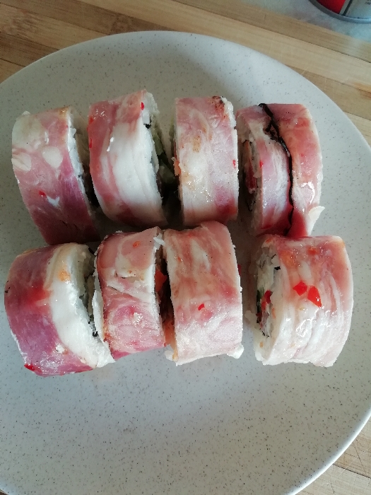 - ролл "В опаленном беконе со спаржей терияки": бекон опаленный, спаржа, обжаренная с соусом терияки, сыр, соус терияки, кунжут, нори, рис - 8 шт.