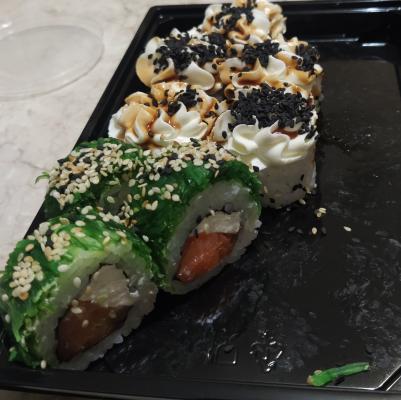 - ролл "Грин Эби Кроунинг": креветка тигровая, краб-микс, чука-салат, сыр, кунжут, нори, рис - 8 шт.