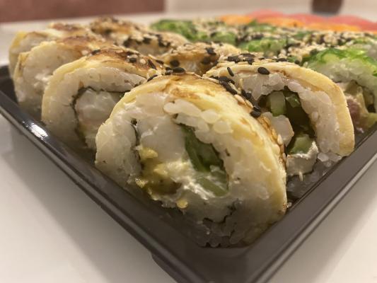- ролл "Крем-шитаке в японском блинчике": грибы шиитаке, обжаренные в соусе терияки, крем-чиз, японский блинчик оранж, такуан, соус терияки, арахис, нори, рис - 8 шт.