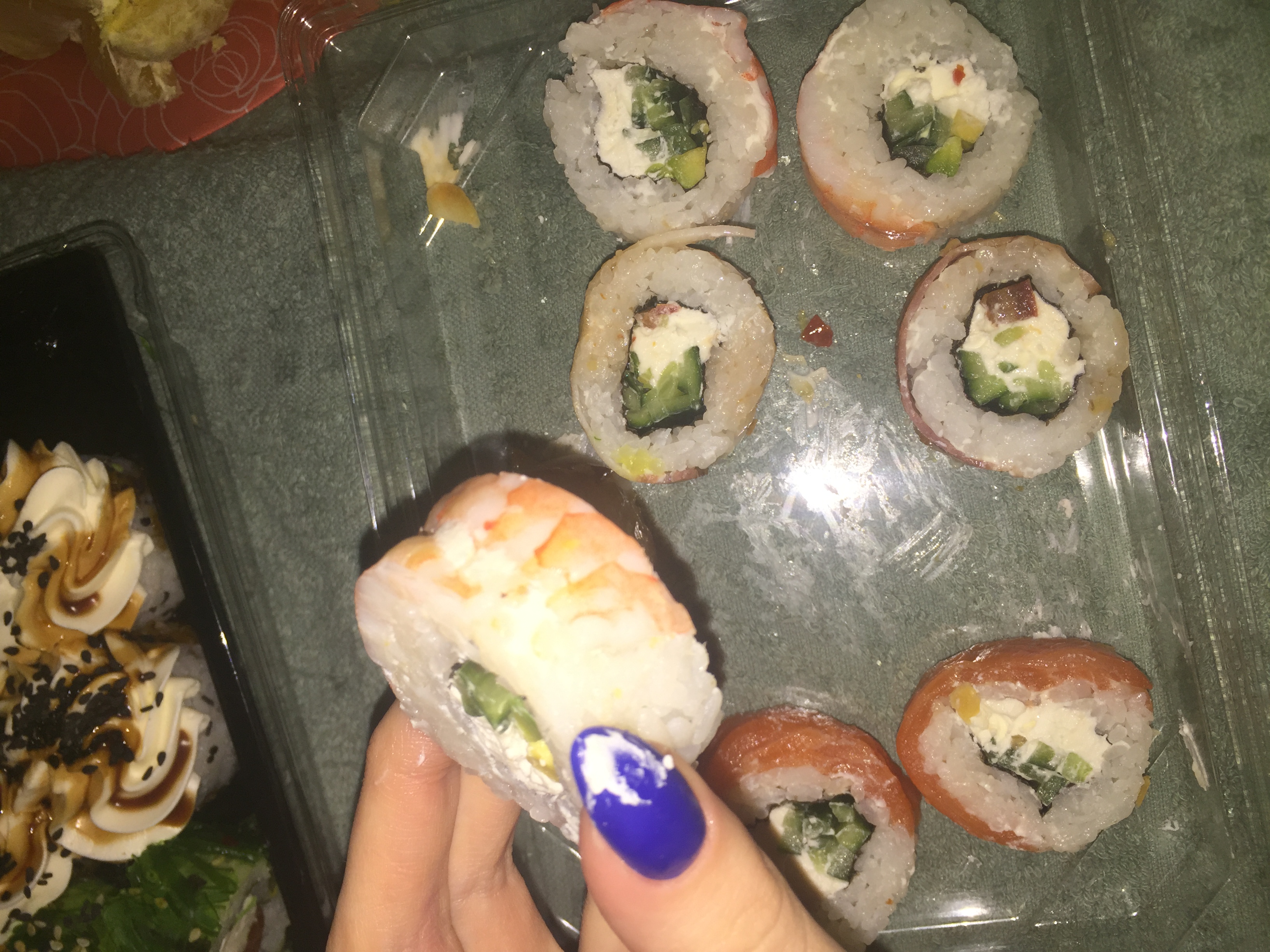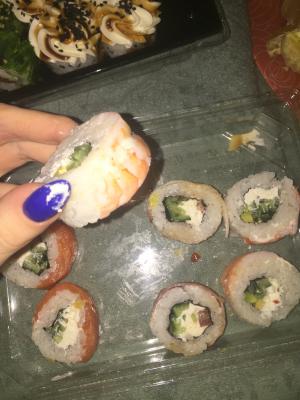Состав: тигровая креветка, авокадо, огурец, сыр, рис, нори