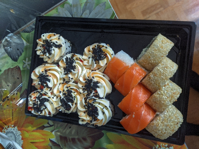 Состав: тунец, такуан, сыр, нори, рис, темпура