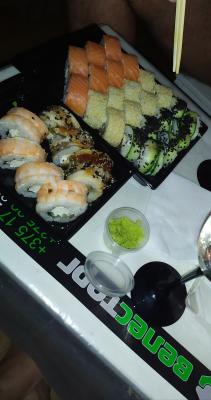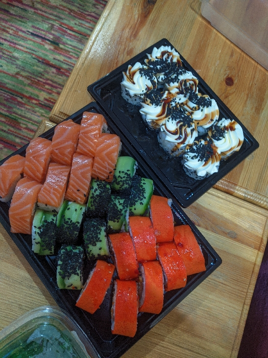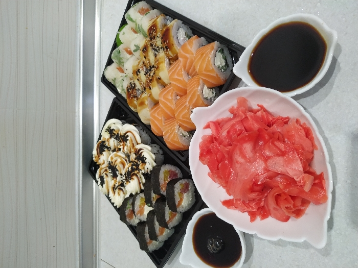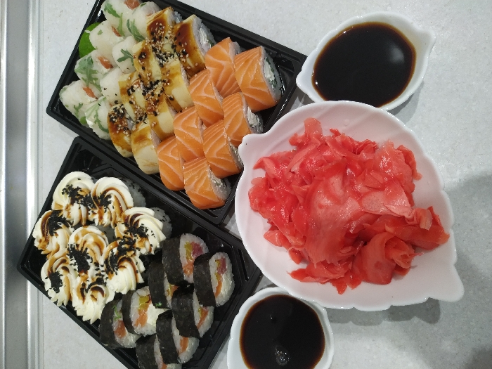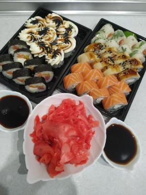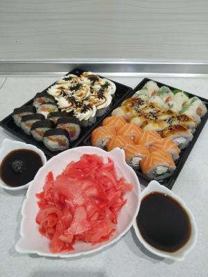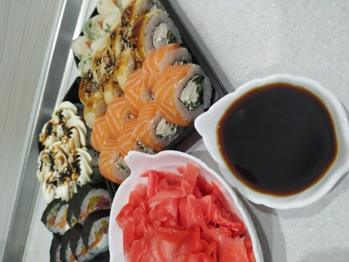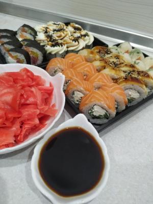 - гарнир: имбирь (25 г), соевый соус (40 мл), васаби (15 г) в подарок!