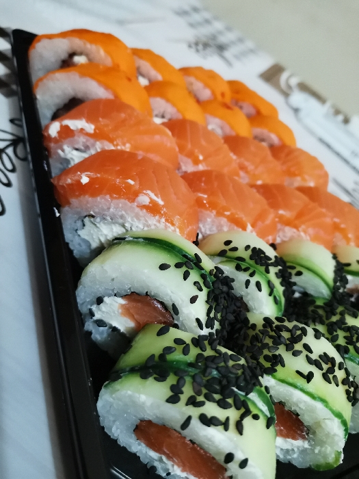 Состав: филе лосося, угорь, креветка тигровая, авокадо, огурец, сыр, рис, нори