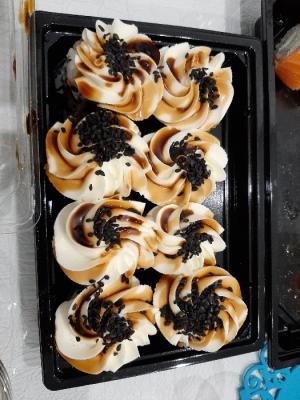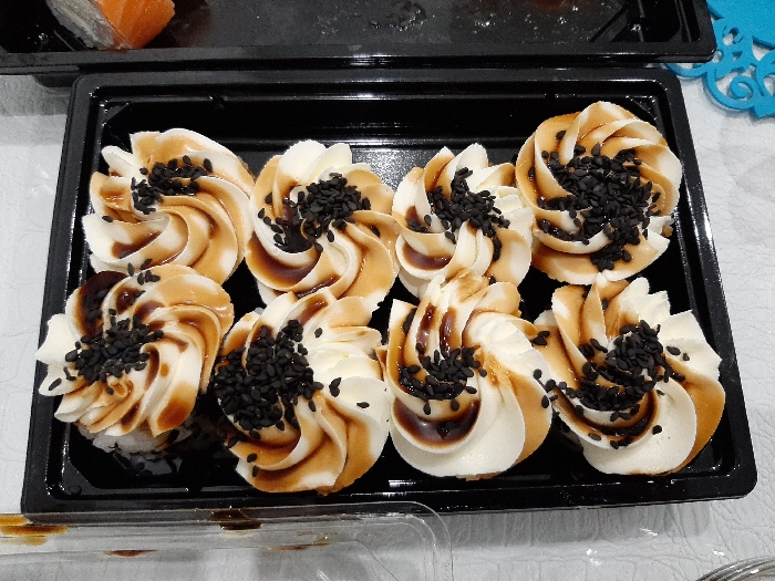 - ролл "Мидии терияки под сырной шапочкой": мидии, морковь терияки, кунжут, крем-сыр, соус терияки, нори, рис - 8 шт.