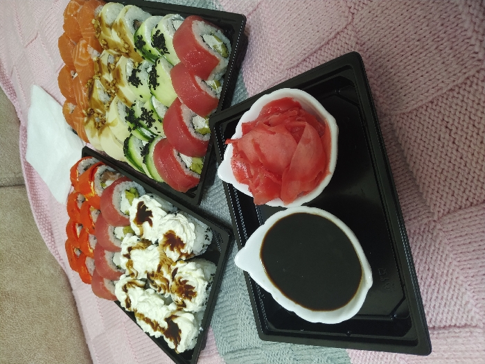 - гарнир: имбирь (25 г), соевый соус (40 мл), васаби (15 г) в подарок!