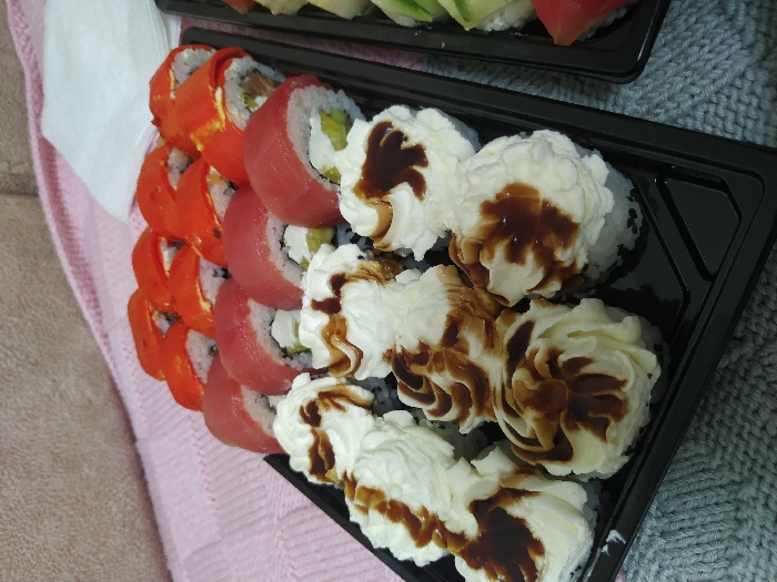 Состав: тунец, такуан, сыр, нори, рис, темпура