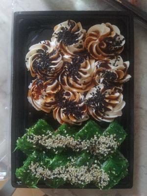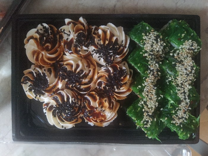 - ролл "Мидии терияки под сырной шапочкой": мидии, морковь терияки, кунжут, крем-сыр, соус терияки, нори, рис - 8 шт.
